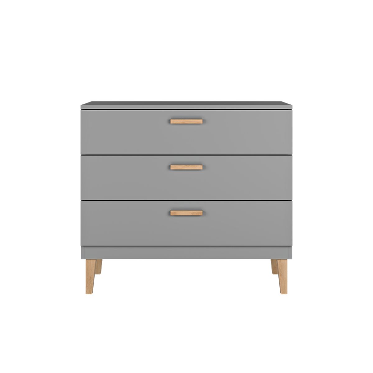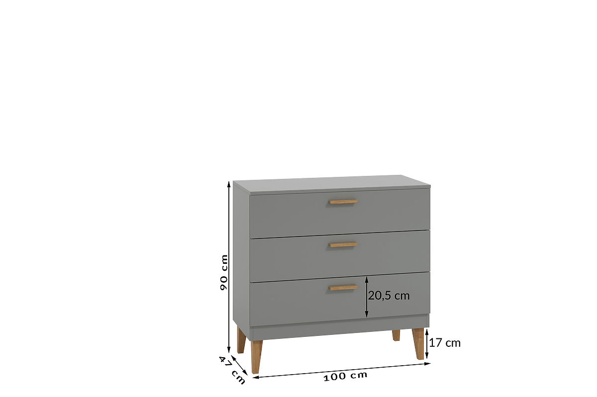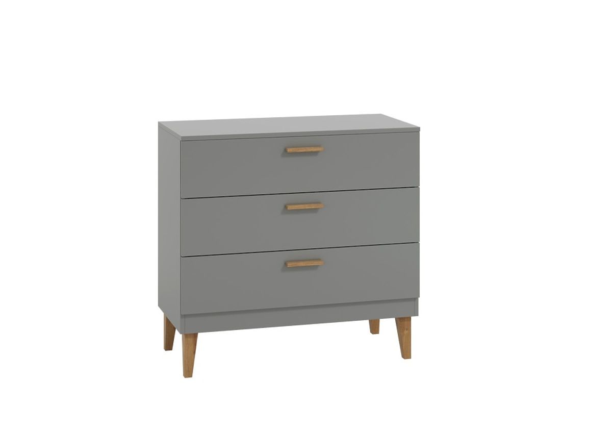 Moderná šedá komoda KUBI s 3 priestrannými zásuvkami. Komoda je vhodná do detských izieb pre deti i študentov. Nadčasový škandinávsky štýl komode svedčí a skvele sa kombinuje z ostatnými kusmi nábytku z rovnakej kolekcie.