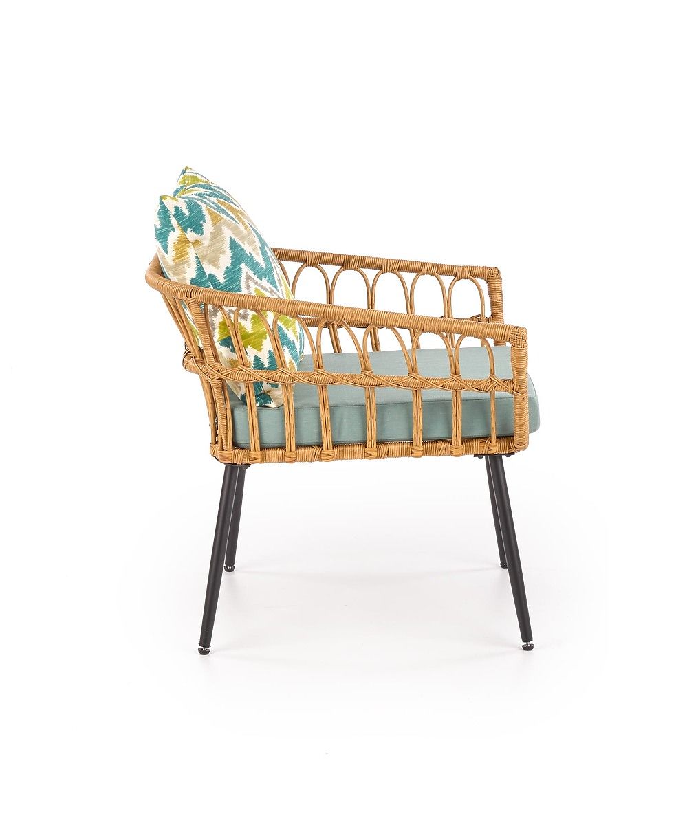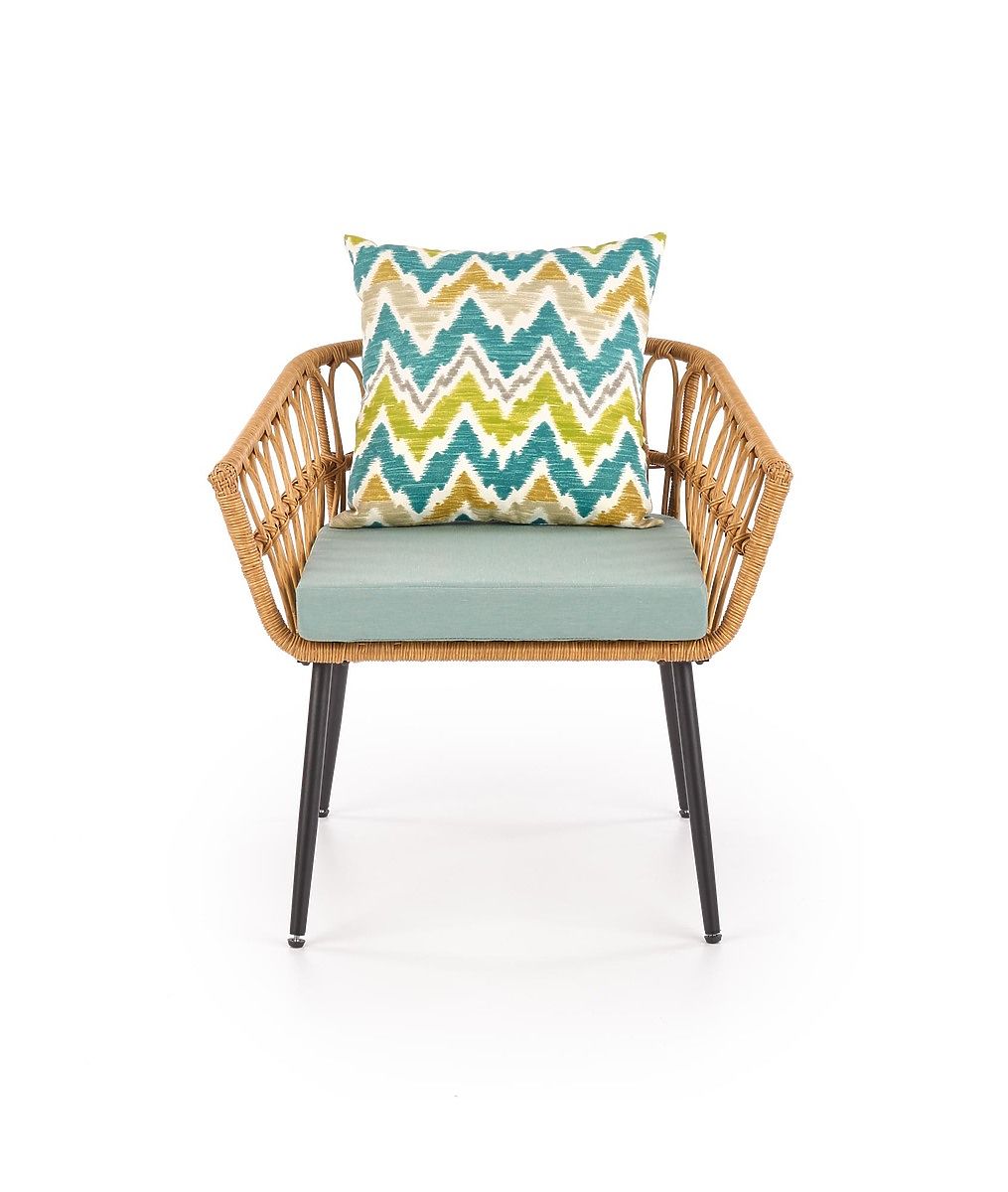 Stabilnú konštrukciu tvorí práškovo lakovaná oceľ v čiernej farbe, ktorá je prepletená syntetickým ratanom. Pre Vaše pohodlie je súčasťou balenia mäkký látkový sedák a farebný vankúš.