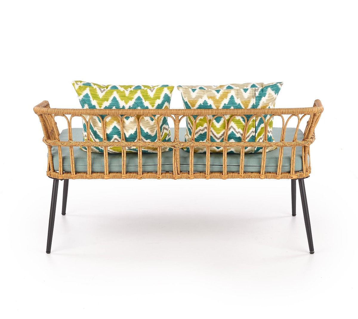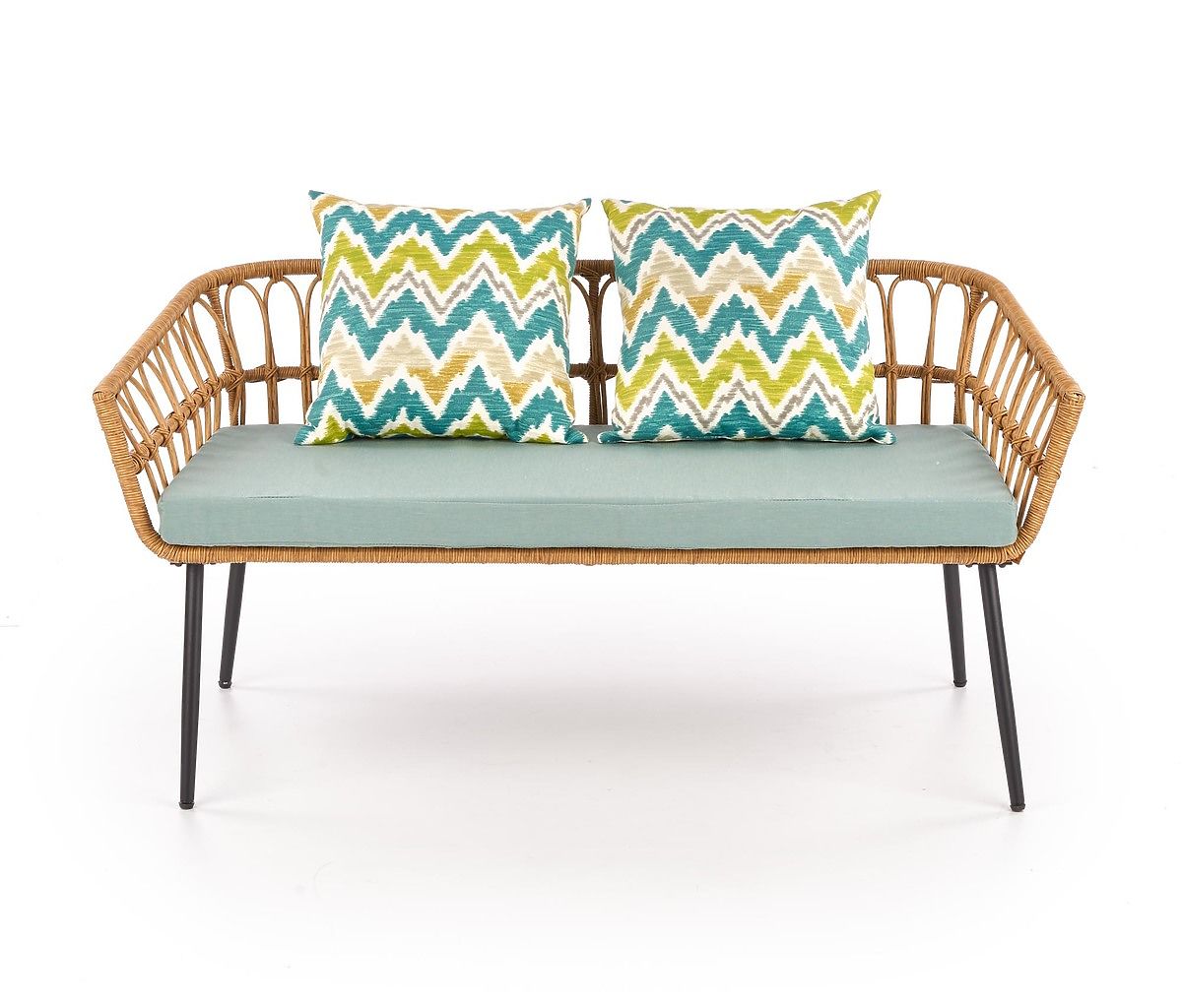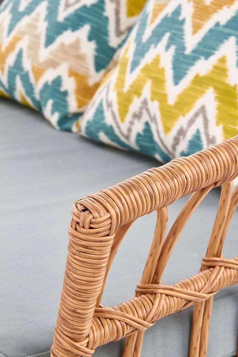 Stabilnú konštrukciu tvorí práškovo lakovaná oceľ v čiernej farbe, ktorá je prepletená syntetickým ratanom. Pre Vaše pohodlie je súčasťou balenia mäkký látkový sedák a dva farebné vankúše.