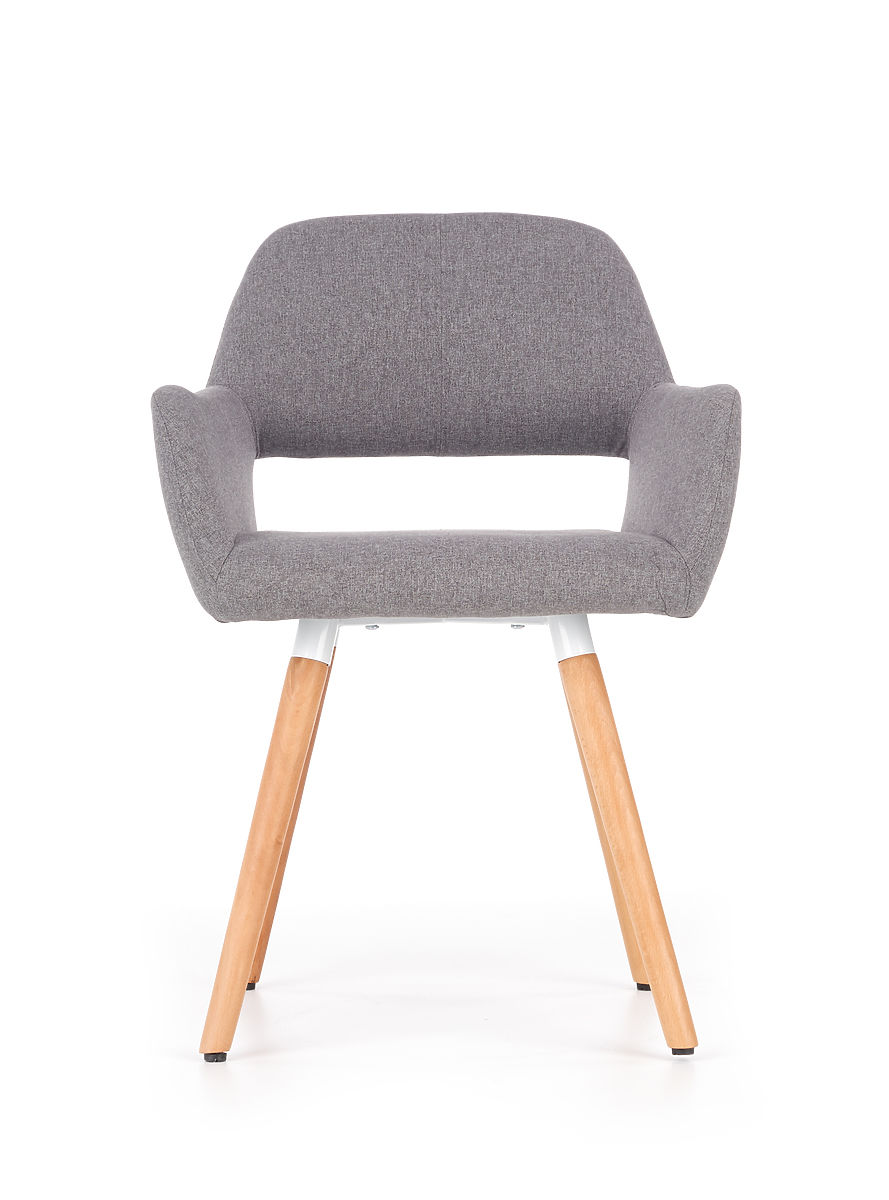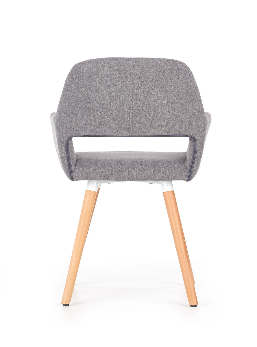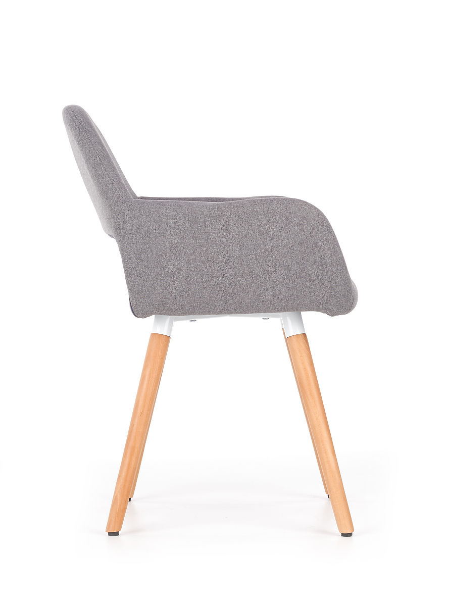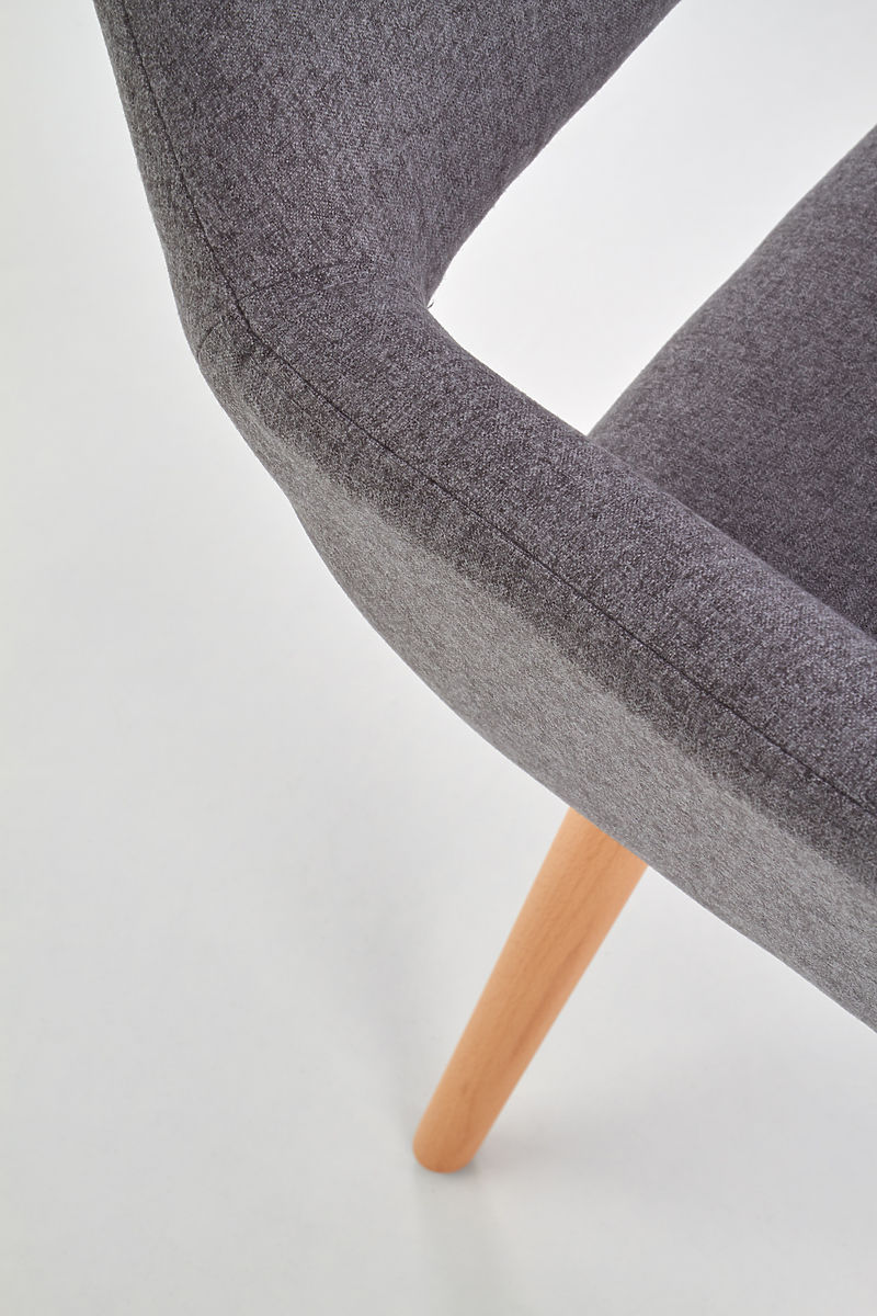 Stolička je čalúnená odolnou látkou sivej farby, ktorá je príjemná na dotyk. Nohy stoličky sú vyrobené z masívneho dreva.