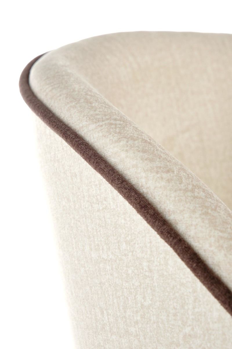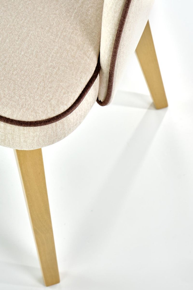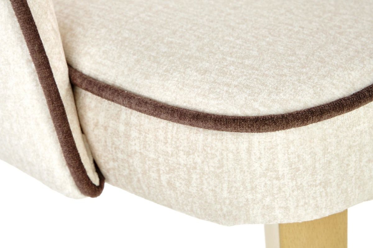 Konštrukcia je vyrobená z masívneho bukového dreva v odtieni medový dub. Sedák aj opierka sú potiahnuté zamatovou látkou krémovej farby s čiernymi detailmi.
