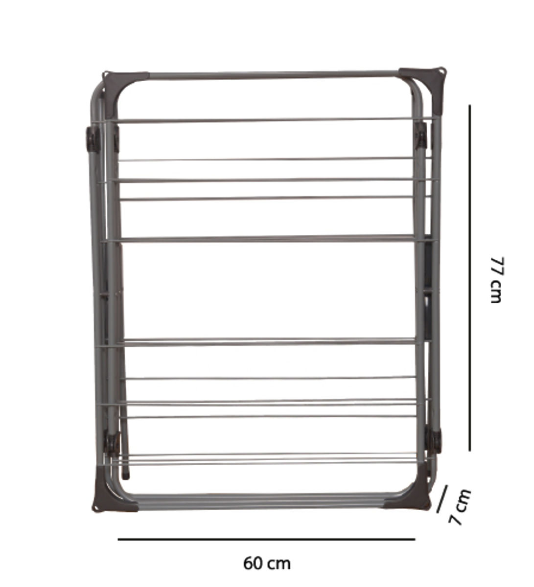 SKLADACIA KONŠTRUKCIAVeľmi dôležitou vlastnosťou sušiaka je jeho veľkosť po zložení. Vertikálny sušiak sa skladá do malých rozmerov 7x60x77cm. Tento rozmer umožňuje bezproblémové skladovanie v skrini alebo malom sklade. Stačí 15 sekúnd na rozloženie alebo zloženie sušiaka.