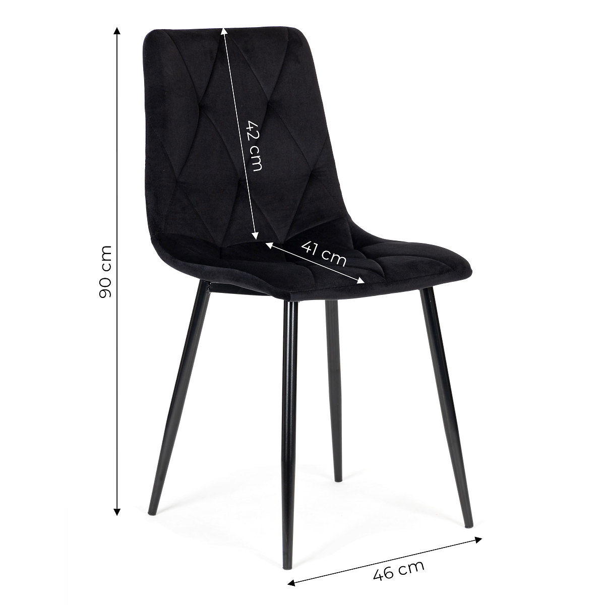 Stoličky budú skvele ladiť s rodinným stolom vo vašej jedálni, obývacej izbe alebo kuchyni. Čierne poťahy sú vyrobené z príjemného a odolného zamatu a ich jednoduchý tvar zaisťuje, že sa dokonale hodia do priestoru obývacej izby, jedálne, ale aj kancelárie alebo reštaurácie. Moderný dizajn a estetické spojenie zamatu a kovu tvoria zostavu pre najnáročnejších používateľov.