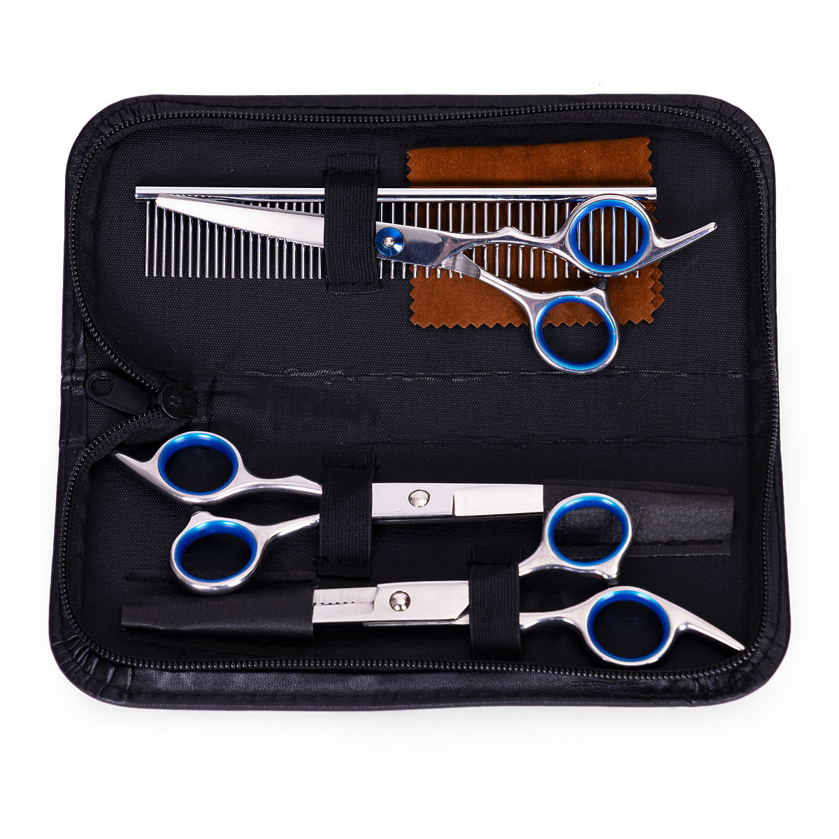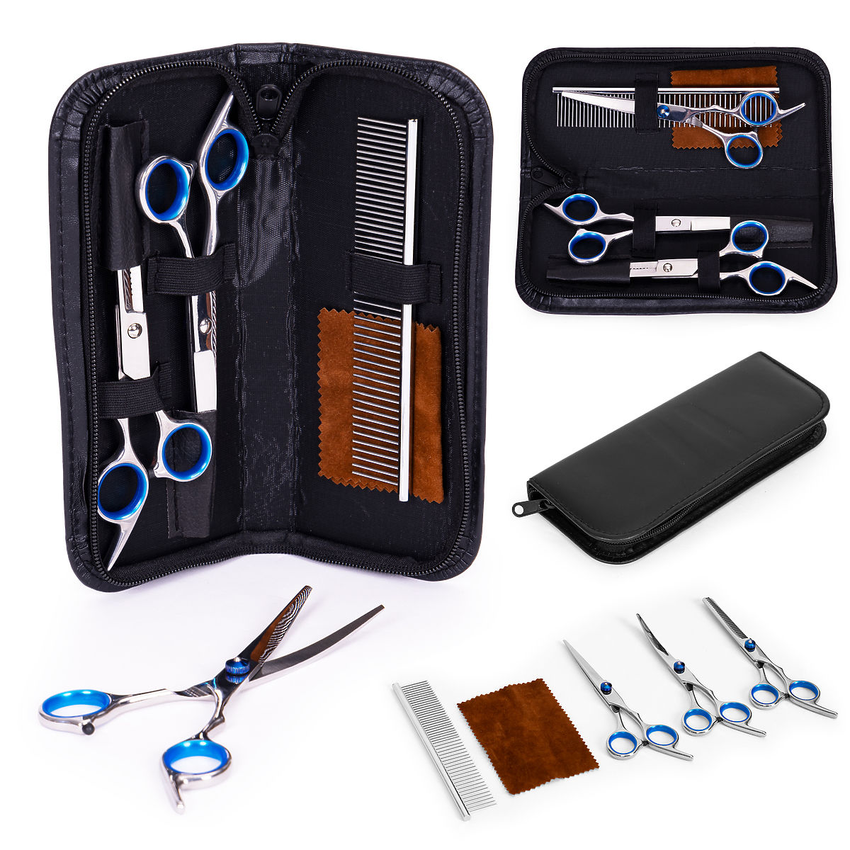 Sada nožníc bola vytvorená s ohľadom na bezpečné strihanie a starostlivosť o psy a mačky, zabezpečujúca presnosť a komfort ako pre majiteľov, tak pre našich miláčikov. Sada obsahuje tri rôzne druhy nožníc, ktoré môžeme prispôsobiť rôznym potrebám starostlivosti. Navyše, groomingová sada obsahuje praktický hrebeň, ktorý je vhodný ako pre hladkú, tak zacuchanú srsť, všetko je zabalené v malom puzdre z ekokože.