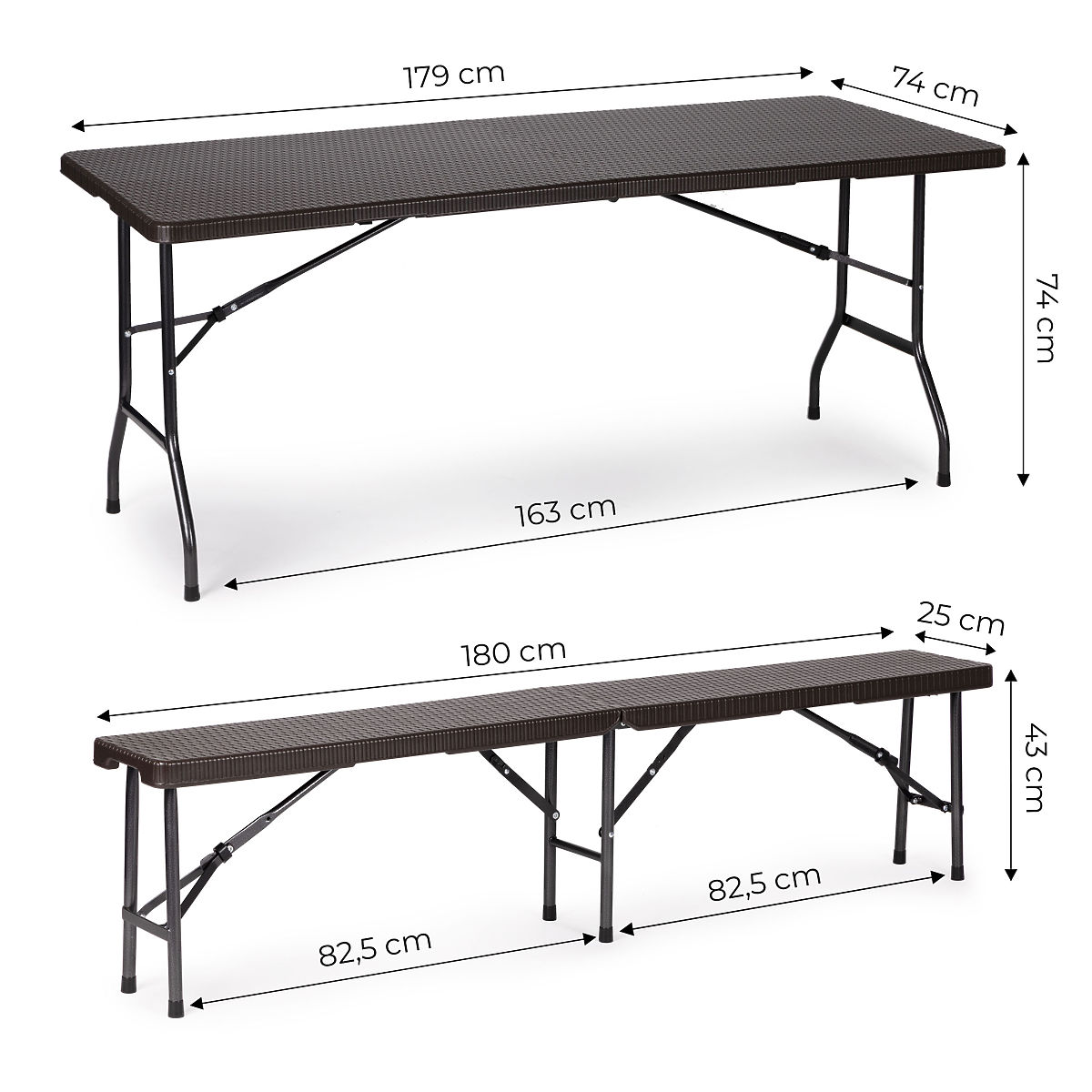 STÔLDoska je vyrobená z materiálu HDPE odolného voči poveternostným vplyvom a mechanickému poškodeniu, vďaka čomu bude nábytok slúžiť po mnoho sezón. Kovový rám zabezpečuje potrebnú stabilitu a umožňuje stolu uniesť zaťaženie až 100 kg.