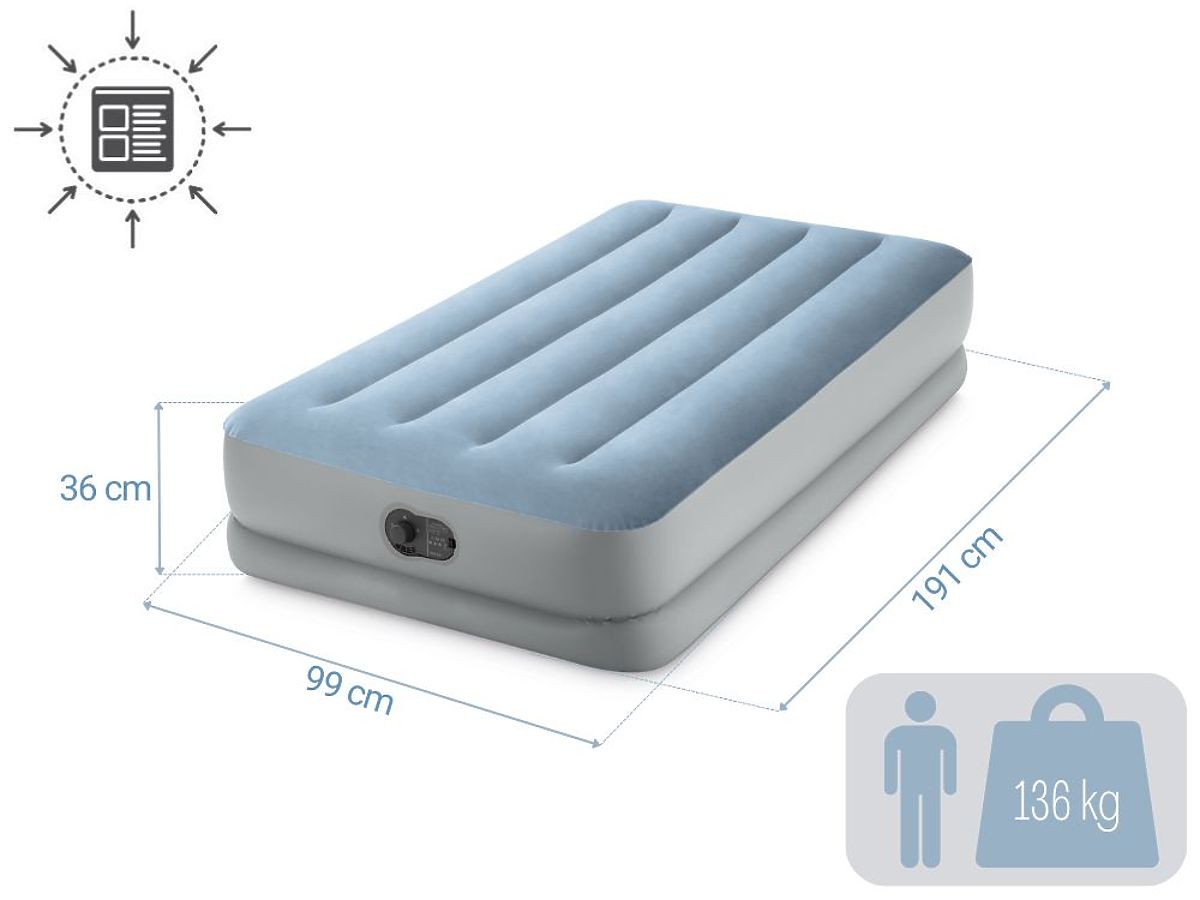 Nafukovací matrac INTEX 64157 je ideálnym riešením v každej situácii – skvele poslúži ako dočasná posteľ pre hostí, pohodlné miesto na spanie na cestách, a tiež ako komfortné lôžko na kempovanie alebo v letnom domčeku. Vďaka veľkým rozmerom a pevnej konštrukcii poskytuje vysoký komfort spánku pre jednu dospelú osobu, bez rizika prepadnutia alebo straty vzduchu. Rýchle nafúknutie a kompaktné skladovanie robia z tohto matraca praktickú a univerzálnu voľbu pre každého, kto oceňuje pohodlie a mobilitu.