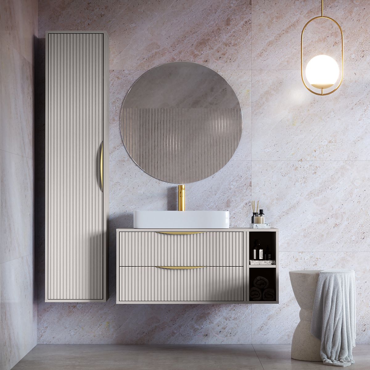 Lukafurniture.sk » Do domu / Kúpeľňa / Kúpeľňové skrinky / Kúpeľňová skrinka stĺpik Avila, ryhovaná, zlatá úchytka, kašmír