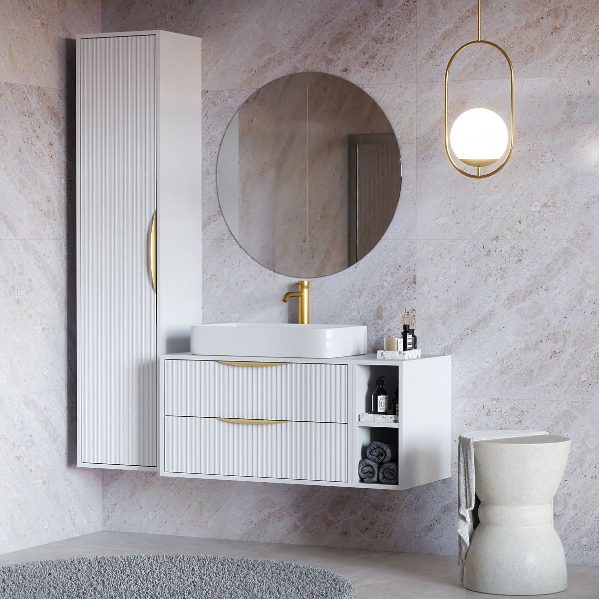 Lukafurniture.sk » Do domu / Kúpeľňa / Kúpeľňové skrinky / Skrinka pod umývadlo na dosku Avila 2.0, 80 cm, drážkovaná, zlaté úchyty, biela