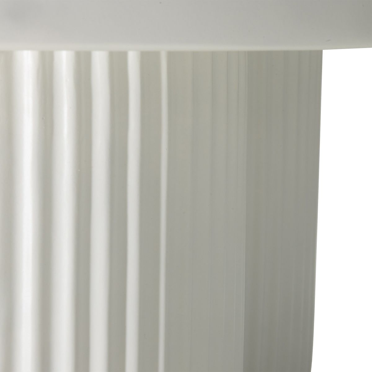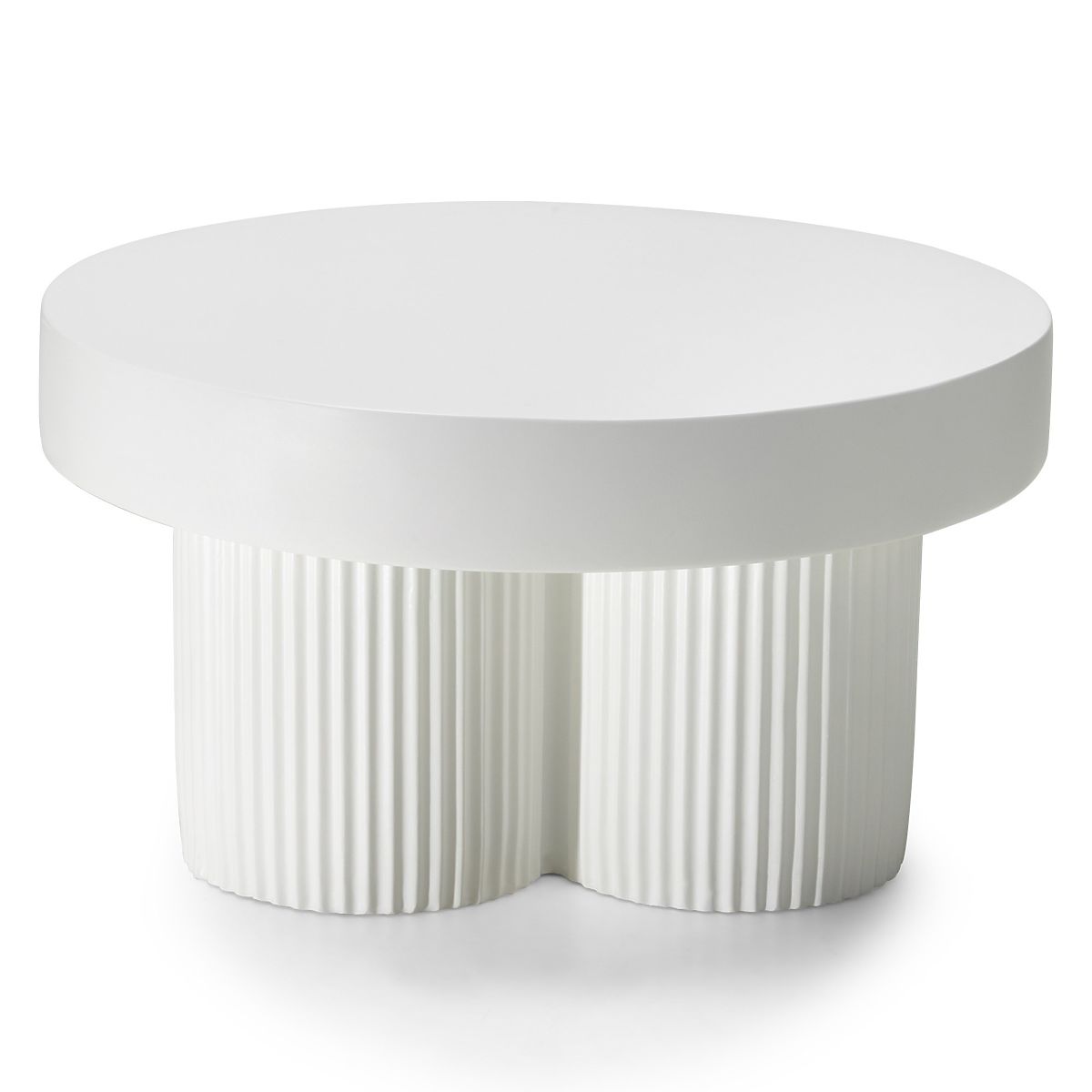 Okrúhly biely stolík s ryhovanou základňou a matným povrchom. .. viac