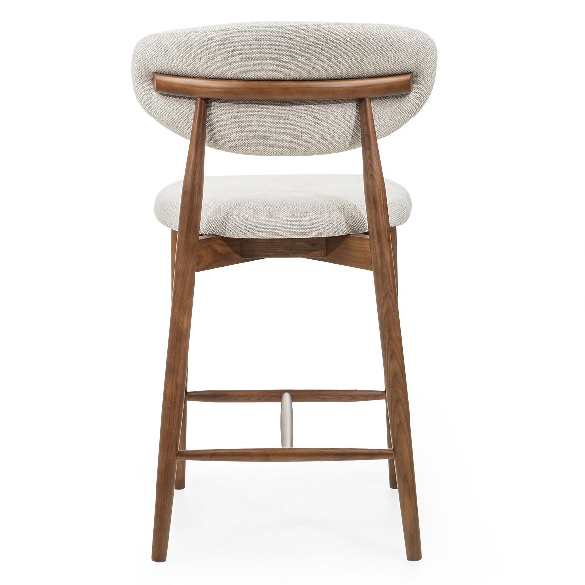 Moderná barová stolička s béžovým sedadlom a hnedými drevenými nohami. .. viac