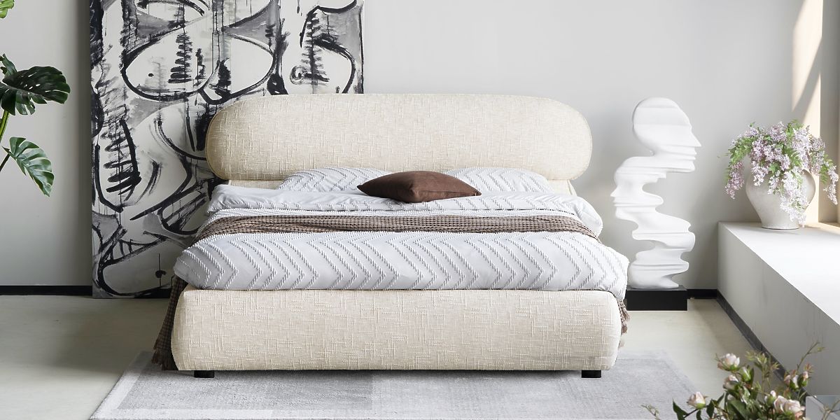Čalúnená posteľ Avola so svetlo béžovým poťahom a úložným priestorom. .. viac
