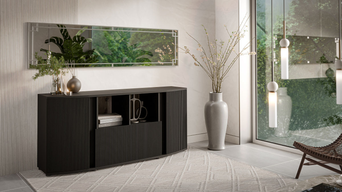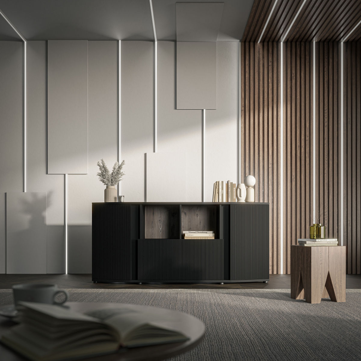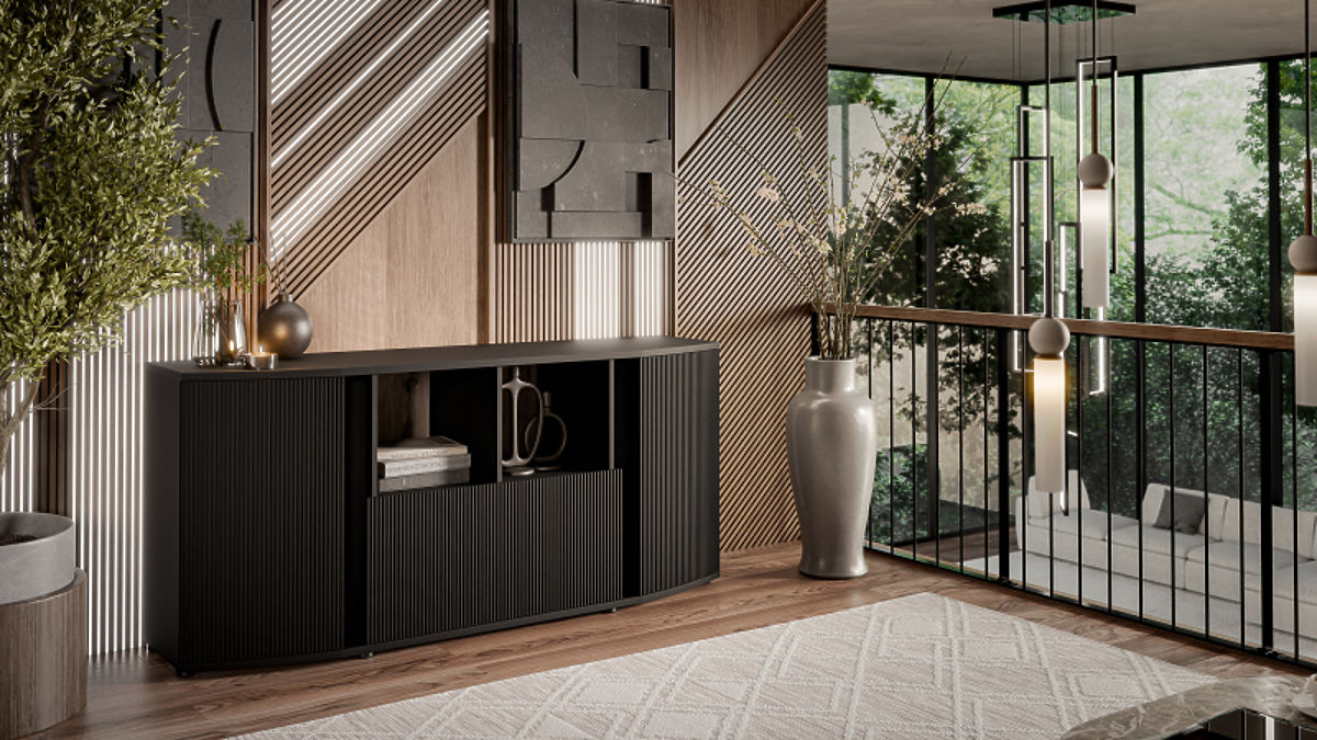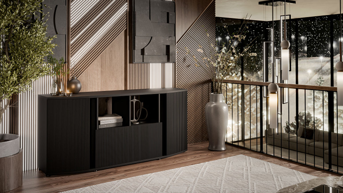 Čierna komoda s dubovým dekorom a frézovanými detailmi. .. viac