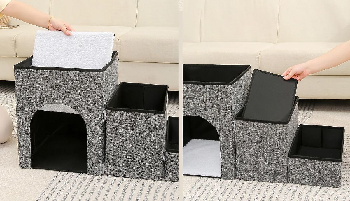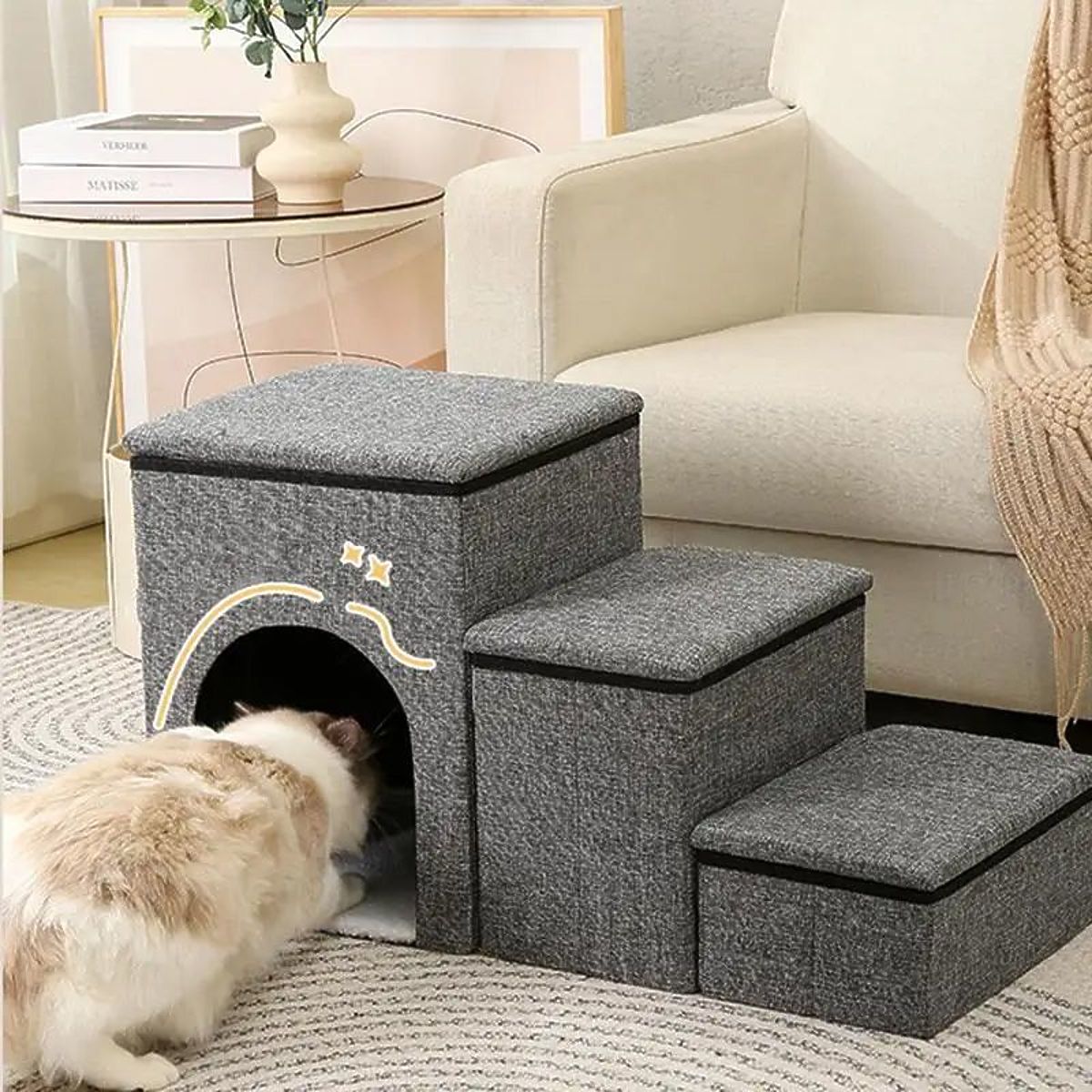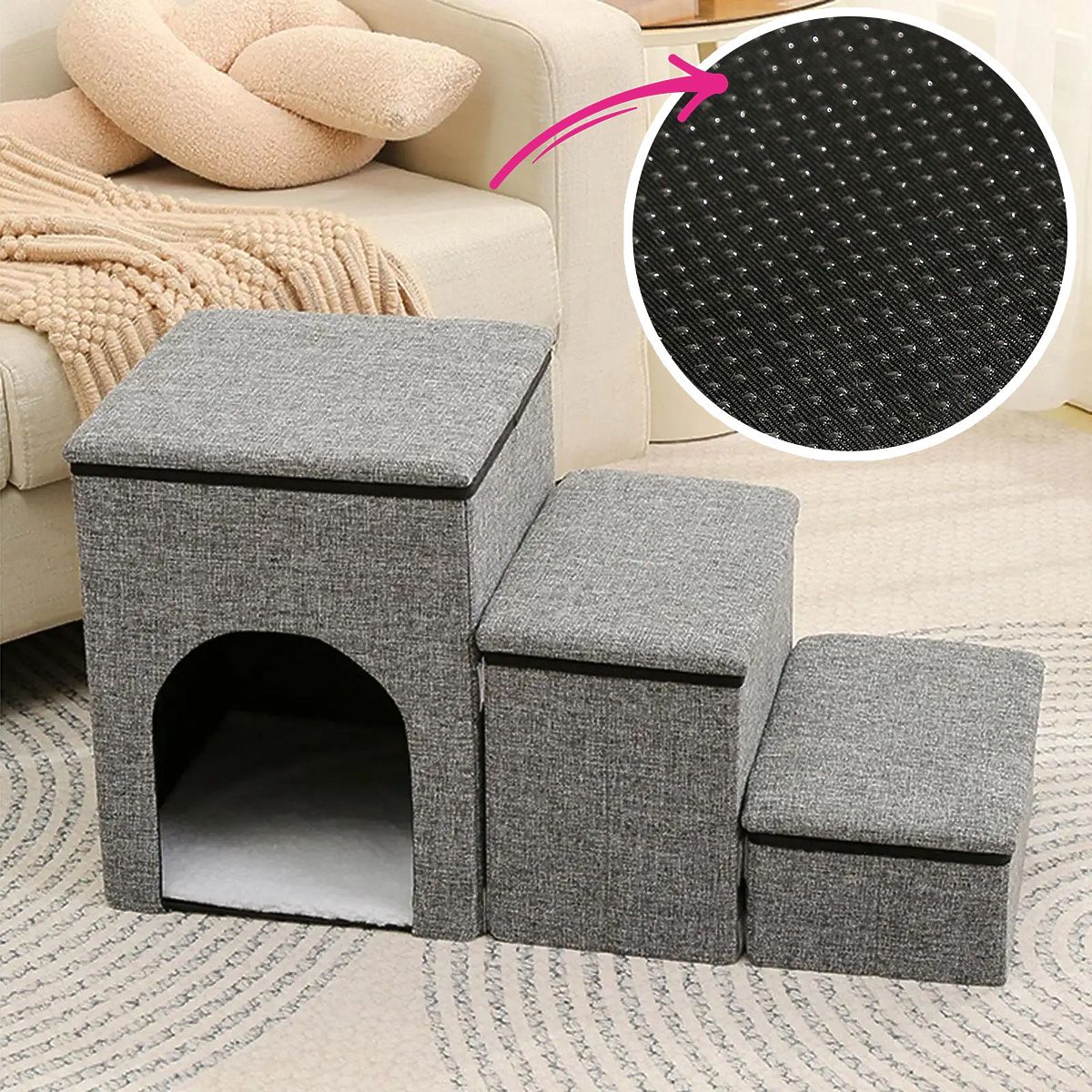 Predstavujeme praktické a funkčné skladacie schodíky pre psa, ktoré uľahčia vášmu miláčikovi prístup na vyššie miesta, ako je pohovka alebo posteľ. Pevná konštrukcia zaisťuje, že sú odolné voči intenzívnemu používaniu. Búdička v prvom schodíku, vystlaná mäkkým materiálom, je ideálnym miestom, kde sa váš miláčik môže schovať, oddýchnuť si a cítiť sa bezpečne. Vstavané úložné priestory sú ideálne na uloženie hračiek, maškŕt alebo iných potrieb pre psa. Schodíky je možné ľahko zložiť, čo uľahčuje ich skladovanie a prepravu.