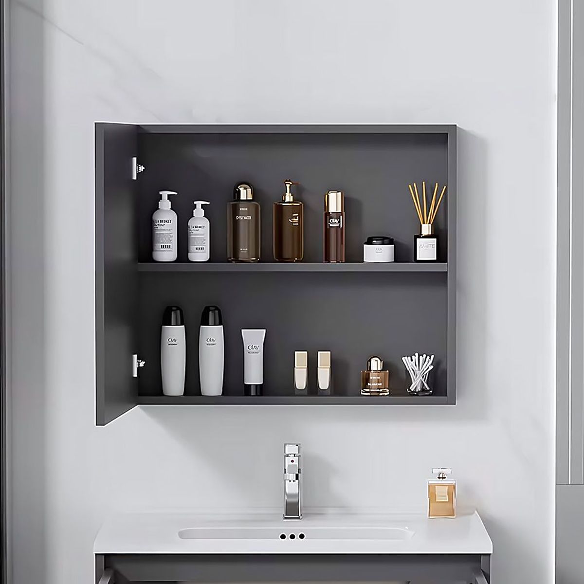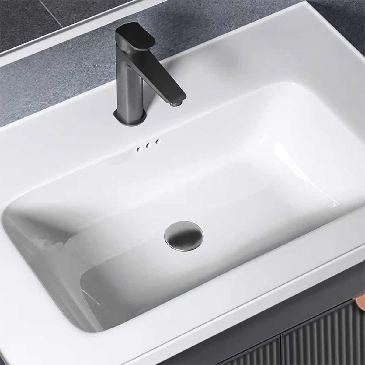 Moderná kúpeľňová súprava Mario – skrinka s umývadlom + skrinka so zrkadlom Súprava kúpeľňového nábytku Mario je návrh, ktorý kombinuje štýlový vzhľad s každodennou funkčnosťou. Skvele sa hodí do moderných kúpeľní, kde záleží na pohodlí a premyslenej organizácii priestoru. Súprava pozostávajúca z závesnej skrinky pod umývadlo a skrinky so zrkadlom je hotové riešenie, ktoré umožňuje vytvoriť praktickú a jednotnú umývadlovú zónu bez nutnosti hľadania samostatných prvkov. h4. Minimalistická forma, ktorá sa hodí všade Model Mario sa vyznačuje charakteristickými, vertikálne drážkovanými čelami, ktoré dodávajú celku moderný a dynamický vzhľad. K dispozícii sú dve farebné varianty – grafitová a biela, obe doplnené o elegantnú úchytku v medenej farbe. Vďaka tomu sa súprava skvele hodí k módnym aranžmánom, ako v tlmenej, tak aj výraznejšej verzii. h4. Praktické riešenia pre každodenné použitie Skrinka so zrkadlom je vybavená otvorenými policami, ktoré zabezpečujú rýchly prístup k dennej kozmetike. Dolná skrinka pojme väčšie predmety, ako sú čistiace prostriedky alebo kozmetika v fľašiach. Celok je montovaný na stenu, čo nielen opticky zväčšuje priestor, ale tiež uľahčuje udržiavanie čistoty okolo nábytku. h4. Umývadlo prispôsobené celku Súčasťou je keramické umývadlo s otvorom pre batériu, prispôsobené veľkosťou dolnej skrinke. Jeho univerzálna forma dobre ladí so zvyškom súpravy, tvoriace jednotný a estetický celok. Mario je súprava, ktorá ponúka jednotný vzhľad a praktické riešenia – pripravená na montáž a okamžité použitie v každej modernej kúpeľni.
