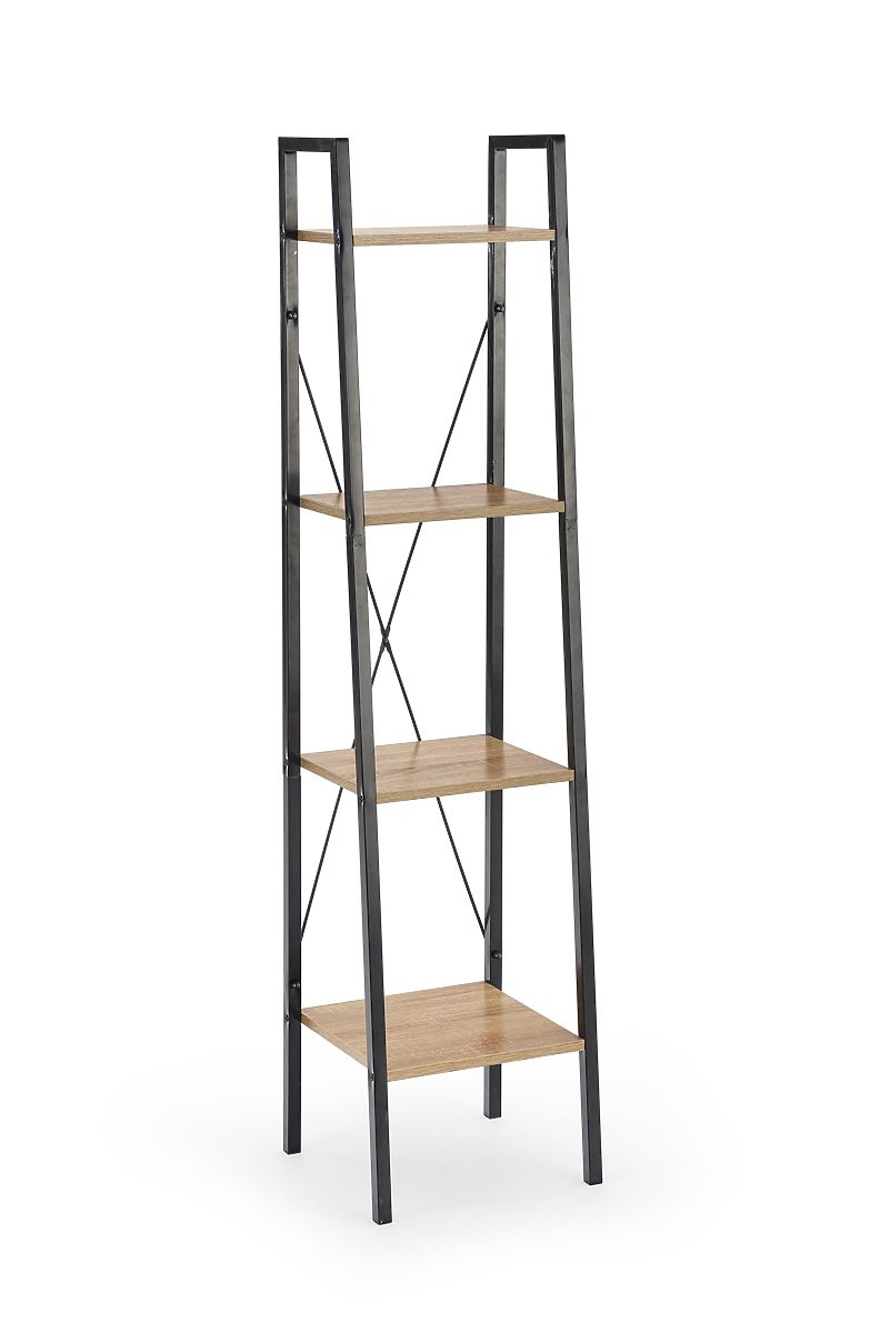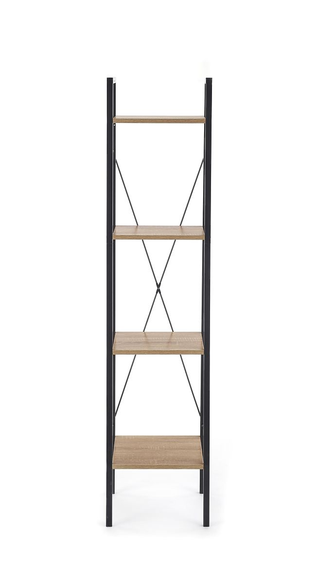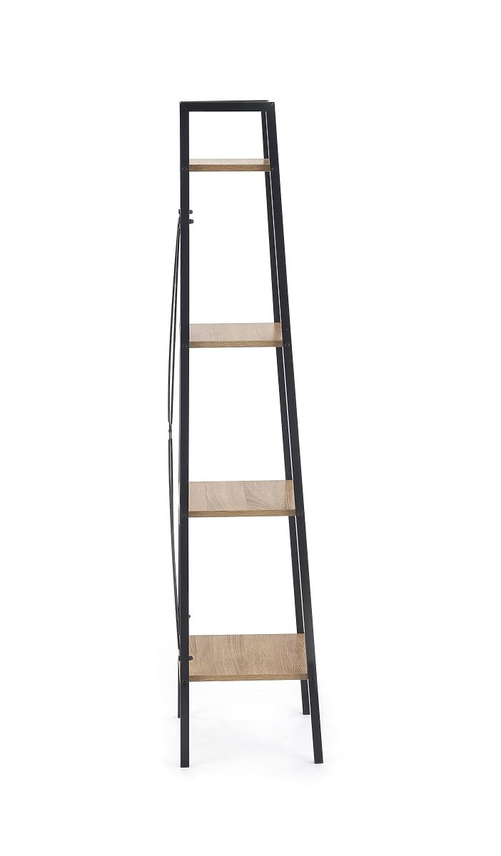Regál je tvorený štyrmi otvorenými policami, ktoré poskytujú prehľadný úložný priestor pre knihy, dekorácie alebo doplnky. Police z laminovanej drevotriesky v dekore dub sonoma sú doplnené pevnou konštrukciou z práškovanej ocele v čiernej farbe, ktorá zaisťuje stabilitu a podčiarkuje industriálny vzhľad.