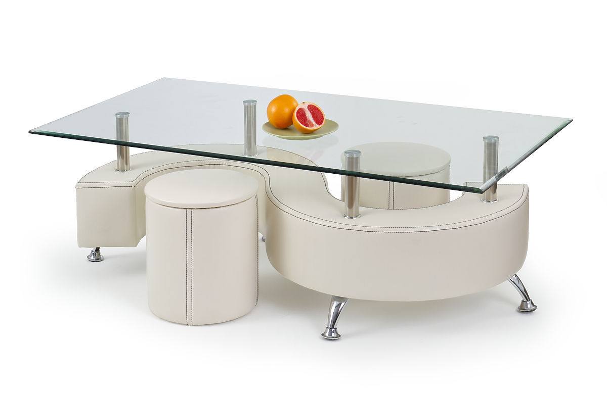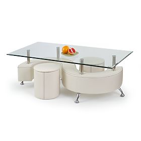 konferenčný stolík s taburetkami, rozmery: 130/70/55 cm, materiál: sklo / chrómovaná oceľ / PVC, farba: biela