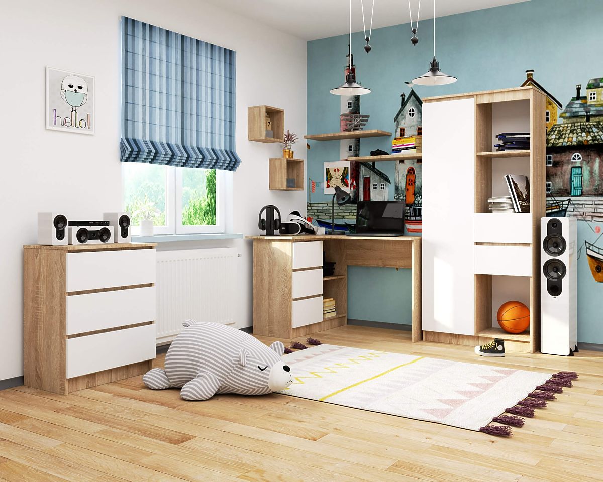 Rohový písací stôl vybavený tromi zásuvkami je zaujímavou ponukou pre tých, ktorí preferujú moderne zariadené kancelárske interiéry. Je to jemná kombinácia klasickej bielej a veľmi módnej farby, ktorou je dub sonoma. Nábytok sa skladá z písacieho stola, dvoch otvorených skriniek a zásuviek. Prezentovaná ponuka sa dobre hodí do každej kancelárie, kde je dôležité čo najfunkčnejšie využitie priestoru. Na výrobu bola použitá laminovaná doska o hrúbke 16 milimetrov - odolný materiál s vysokou odolnosťou proti poškodeniu. Rohový počítačový stôl určite uspokojí aj tých najnáročnejších zákazníkov, pre ktorých je dôležitý vzhľad, kvalita a funkčnosť. Pozývame vás tiež na objavenie ďalšieho nábytku z tejto kolekcie - komôd, regálov a skríň, ktoré sú k dispozícii v rovnakej farebnej kombinácii. Vďaka nim sa určite podarí vytvoriť vhodný priestor pre kancelársku prácu alebo štúdium - ako doma, tak v kancelárii.