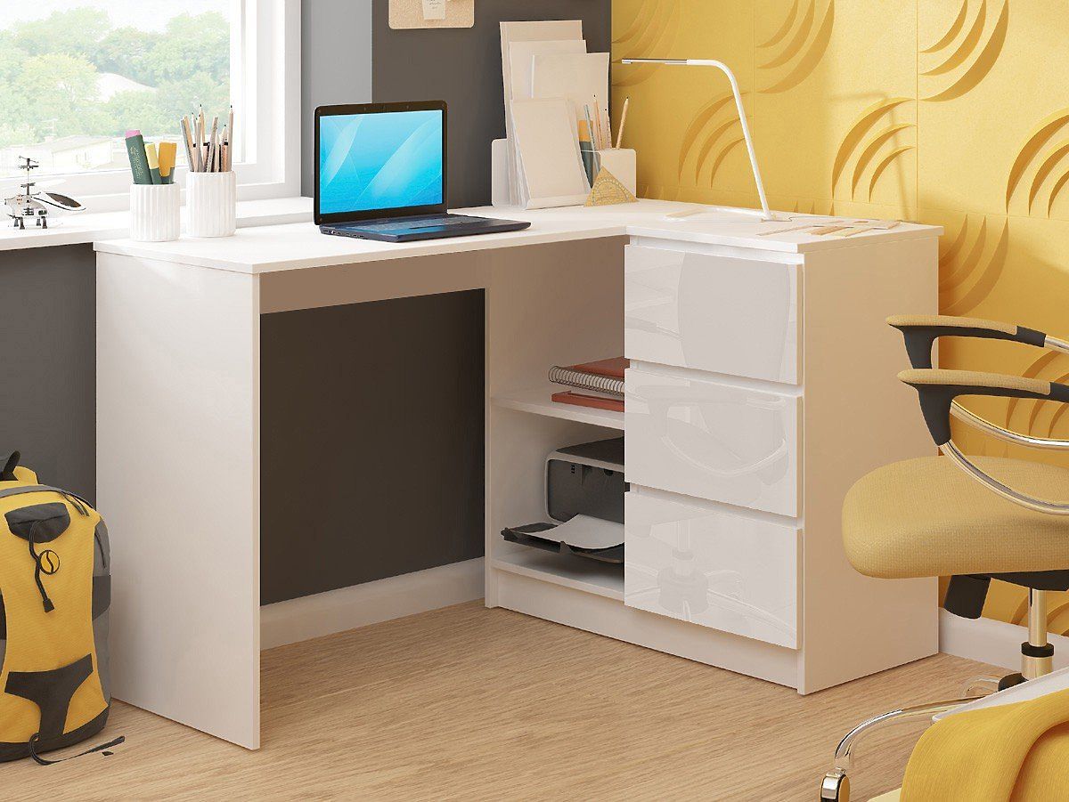 Lukafurniture.sk » Nábytok / Písacie stoly / ROHOVÝ PÍSACÍ STÔL B16 124 cm PRAVÝ 3 ZÁSUVKY PK BIELY / BIELY LESK