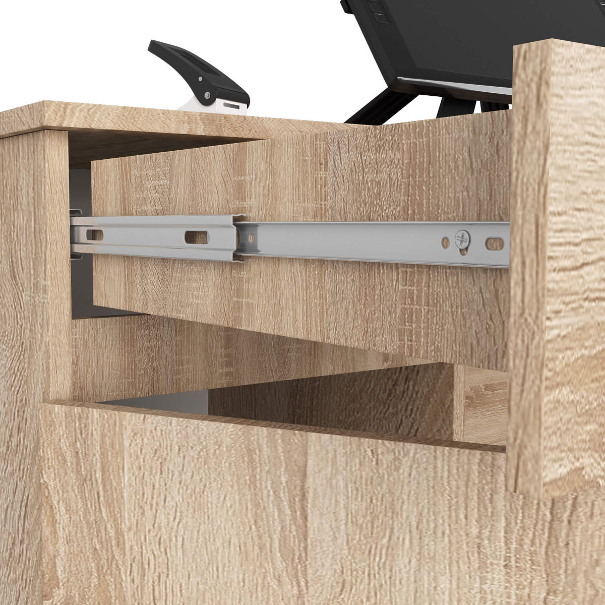 Stôl je vyrobený vo farbe dubu sonoma, vďaka čomu vyzerá veľmi elegantne. Perfektne zapadne do priestoru takmer každej miestnosti. Bol navrhnutý špeciálne pre užívateľov počítača, preto má poličku na klávesnicu a voľné zásuvky, v ktorých možno ukladať dôležité predmety, ako sú káble, disky alebo slúchadlá. Stôl je určený na samostatnú montáž. Vďaka špeciálnemu návodu je to však veľmi jednoduché. Prehľadne ukazuje, ako to urobiť krok za krokom. Hoci je nábytok vyrobený z vysoko kvalitných materiálov a je odolný proti poškodeniu, ponúkame našim zákazníkom 24-mesačnú záruku.