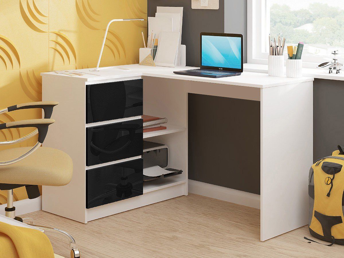 Lukafurniture.sk » Nábytok / Písacie stoly / ROHOVÝ PÍSACÍ STÔL B16 124 cm ĽAVÝ 3 ZÁSUVKY PK BIELY / ČIERNY LESK