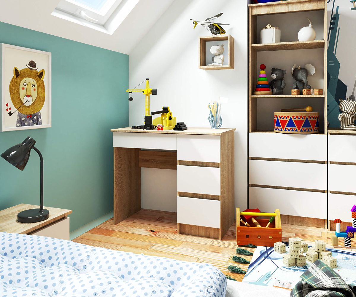Písací stôl so štyrmi zásuvkami určený pre mládež.