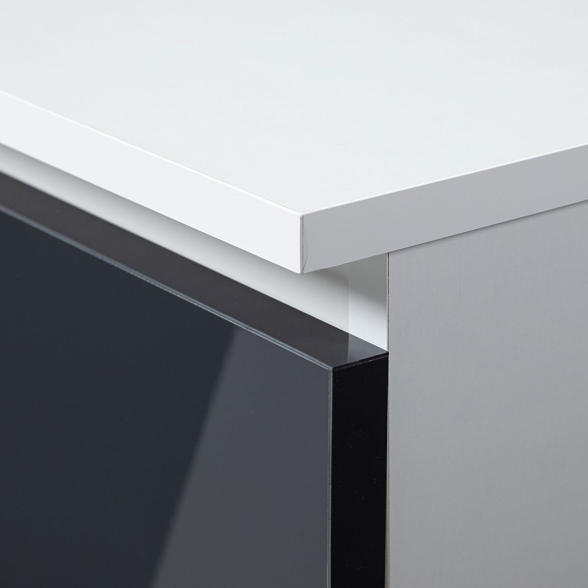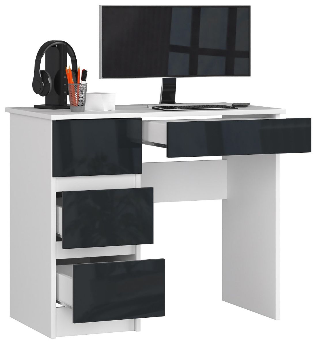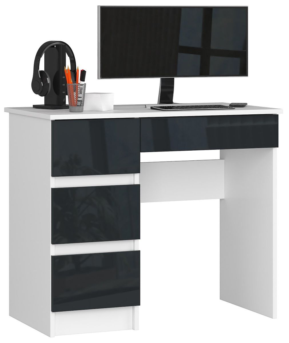 Minimalistický stôl A-7 90 cm (ľavý) v univerzálnom tóne, ktorého grafitové čelá sa vyznačujú vysokým leskom, je produkt, ku ktorému možno prispôsobiť ďalšie prvky vybavenia z tej istej kolekcie - priestranné skrine, funkčné regály a rôzne veľkosti komod.