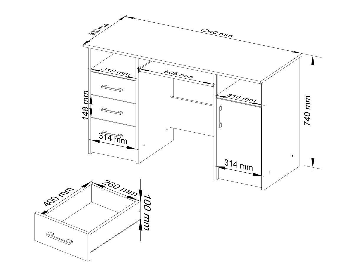 Vyrobené z laminovanej dosky odolnej proti oderu. Doska, boky a čelá sú opatrené ABS hranou. Má výsuvnú policu na klávesnicu, 3 zásuvky a dvierka s čelami z laminovanej dosky.