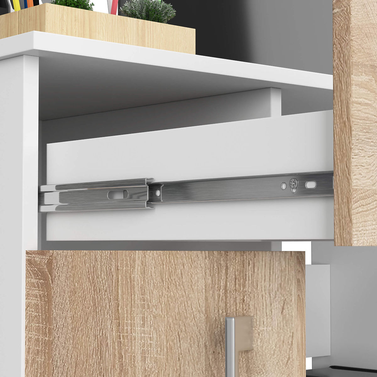Počítačový stôl JAY je vyrobený z laminovanej nábytkovej dosky odolnej proti oderu v dvoch farbách. Štýlovo strohý biely pracovný povrch stola skvele ladí s teplými optickými čelnými plochami zásuvky a dvierok v farbe dub sonoma. Celkový vzhľad je matný. Na pravej strane nábytku je pracovný priestor s výsuvnou policou na klávesnicu pod pracovnou doskou. Bližšie k základni nábytku je ďalšia polica a ešte jedna, určená pre skriňu počítača PC. Ľavá strana stola obsahuje zásuvku na kovových guľôčkových pojazdoch umiestnenú tesne pod pracovnou doskou. Pod ňou je skrinka s dvoma policami a výklopnými dvierkami.