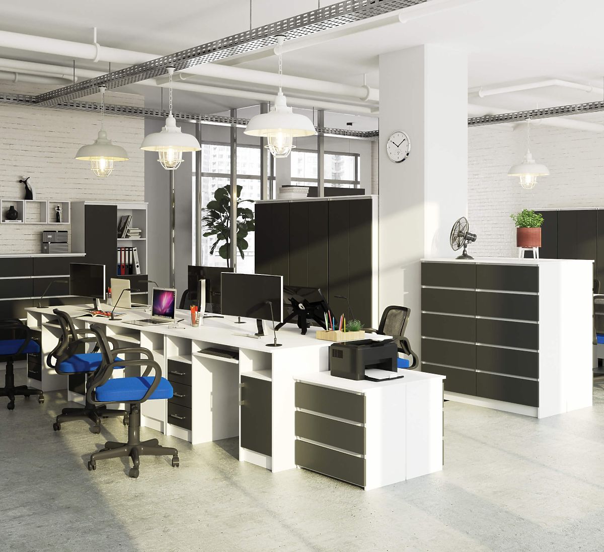 Počítačový stôl ANA 124 cm vďaka klasickej kombinácii bielej a grafitovo šedej farby ľahko zapadne do každého interiéru. Bol navrhnutý s ohľadom na kancelárske priestory a pracovne. Hodí sa tiež do izby tínedžera. Na doske stola je veľa miesta – môžete na ňu umiestniť monitor a ďalšie nevyhnutné pracovné predmety podľa potreby. Pre klávesnicu je tu samostatná výsuvná polica. Stôl ponúka veľké množstvo priestoru pre ľubovoľné usporiadanie: dve výklenky, tri zásuvky a skrinku s policou. Celá konštrukcia je vyrobená z laminovanej dosky, ktorá je ľahko udržiavateľná a odolná proti oderu. Stôl ANA je elegancia, funkčnosť a solídnosť v jednom.