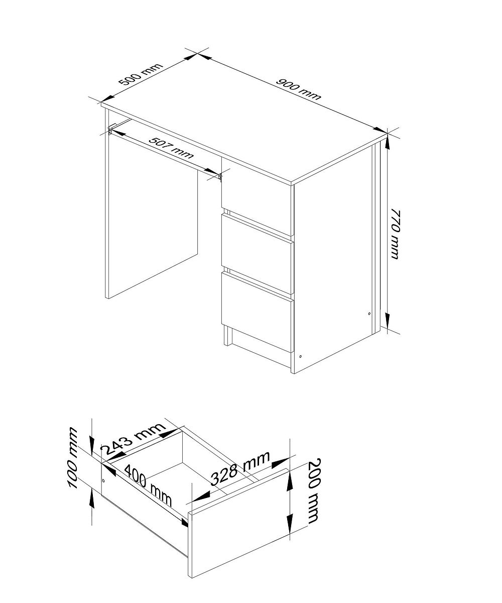 Stôl z laminovanej dosky je produkt, ktorý sa vyznačuje vysokou odolnosťou proti oderu, vďaka čomu bude schopný slúžiť v dokonalom stave po dlhú dobu. Jeho univerzálny vzhľad zaisťuje, že sa bude dobre vynímať v každej miestnosti. Nábytok je vybavený pracovnou doskou, výsuvnou policou a tromi priestrannými zásuvkami, ktoré možno usporiadať podľa individuálnych potrieb.