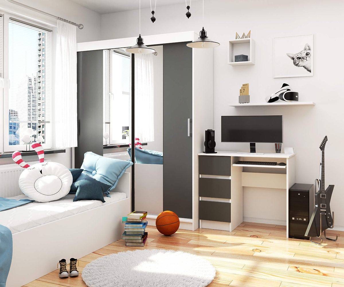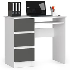 Písací stôl A-6 biely/grafitovo šedý sa skvele hodí do detskej a študentskej izby, ale aj do pracovne. Jeho malé rozmery umožnia tiež usporiadanie priestoru na štúdium alebo prácu na diaľku v spálni alebo obývacej izbe. Stôl je tiež ideálny pre malé, útulné kancelárie. Vďaka kombinácii bielej, hladkej dosky s grafitovo šedým vzorom sa nábytok hodí ako k moderným, tak k viac klasickým kusom nábytku.