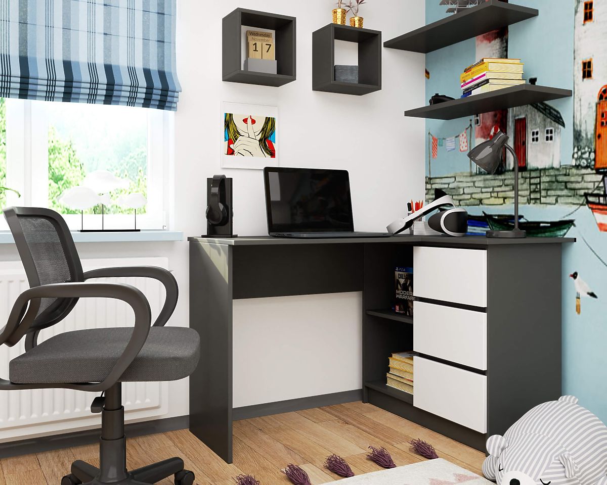 V domoch, bytoch a kanceláriách sú stále častejšie vidieť rohové stoly. Nielenže sú módne, ale aj funkčné. Ľudia, ktorí hľadajú nábytok v šedom odtieni s bielymi čelami, môžu zvoliť rohový stôl B16 so šírkou 124 cm. Skvele sa hodí na štúdium alebo pracovné povinnosti a zároveň má moderný vzhľad. Obsahuje police a zásuvky, do ktorých možno umiestniť dokumenty, knihy, kancelárske potreby a mnoho ďalšieho. Nábytok sa vyznačuje trvanlivosťou. Je určený na samostatnú montáž, čo nie je ťažké, pretože ku každej objednávke je priložený návod.