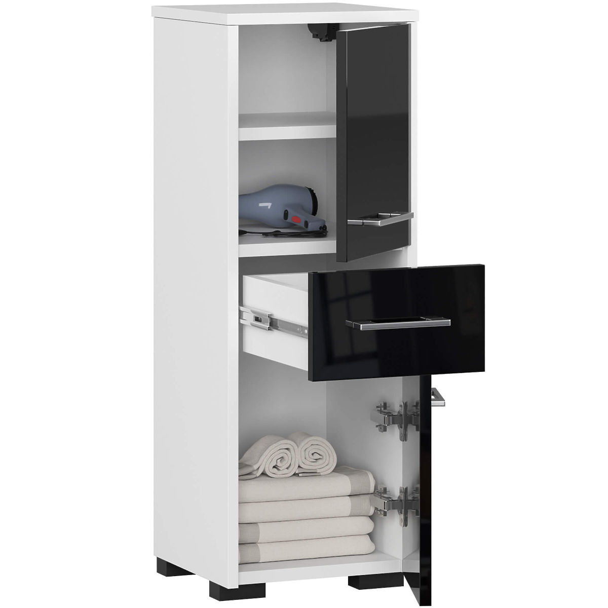 Pre kúpeľňové interiéry ponúkame skrinku-stĺp, kúpeľňový regál fin 2D 1SZ (biely/čierny lesk), ktorý: