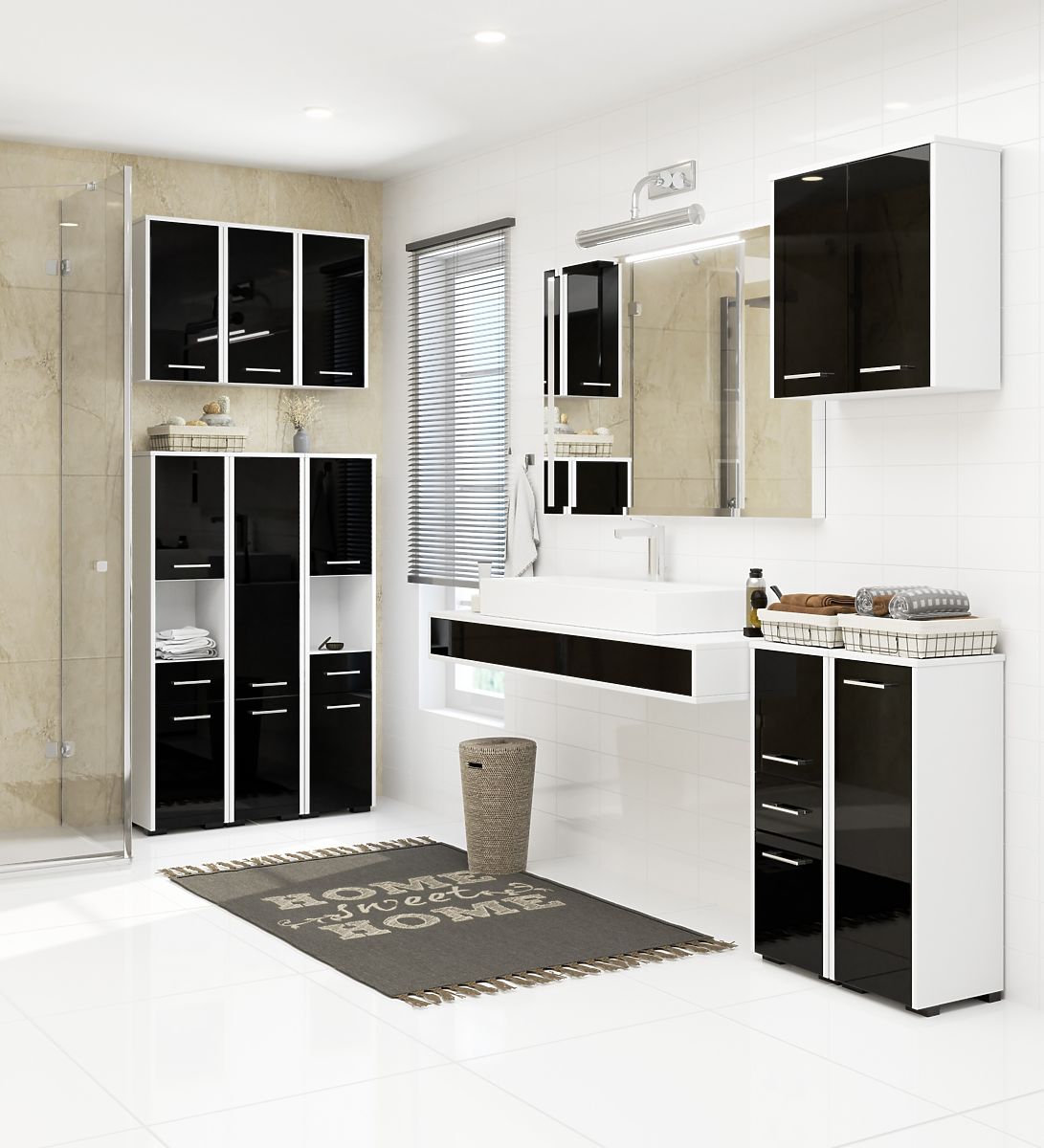 Kúpeľňová skrinka s čiernym leskom a bielym korpusom pre elegantný dizajn. .. viac