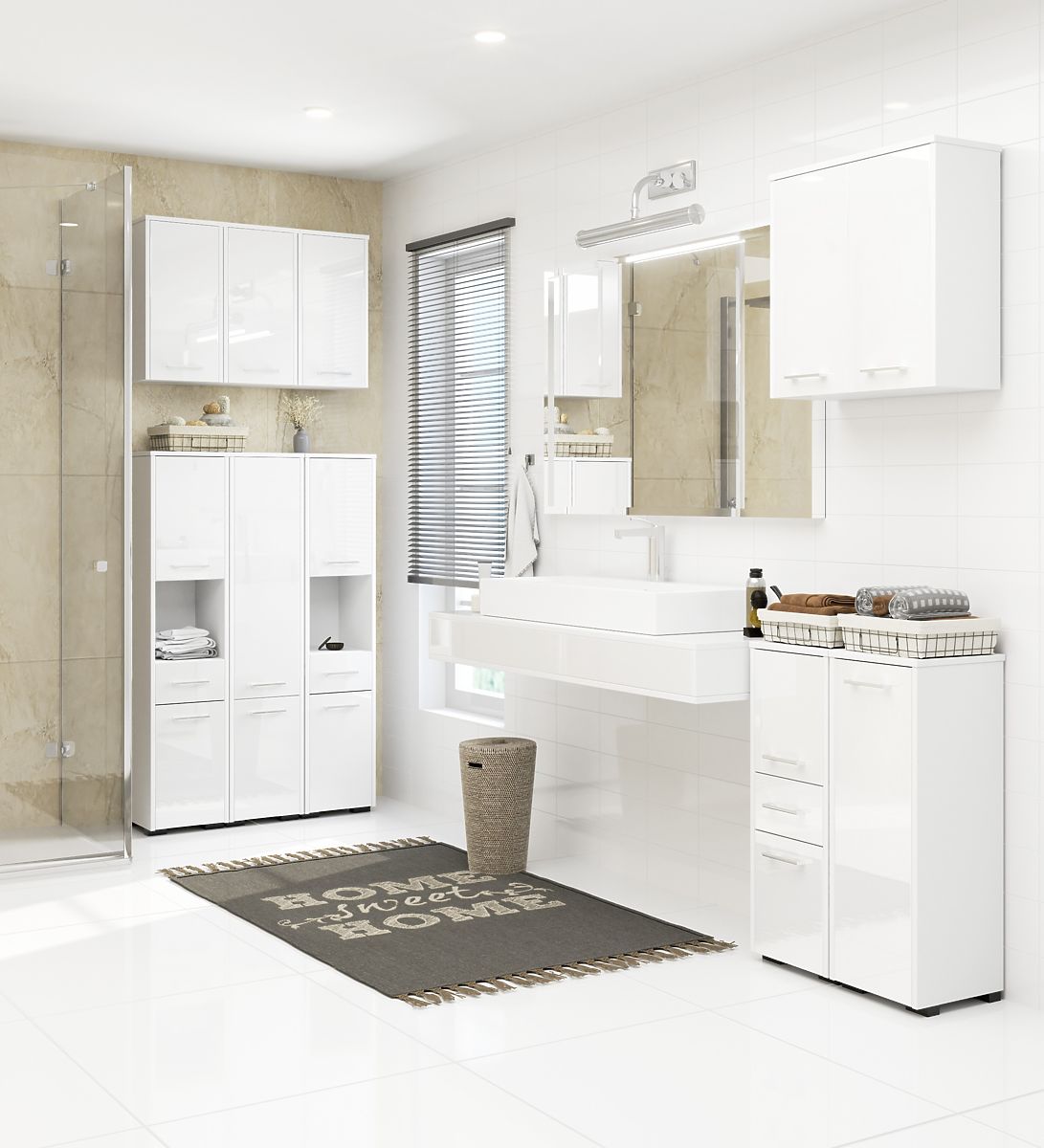 Kúpeľňový regál s moderným bielym leskom a veľkým úložným priestorom. .. viac