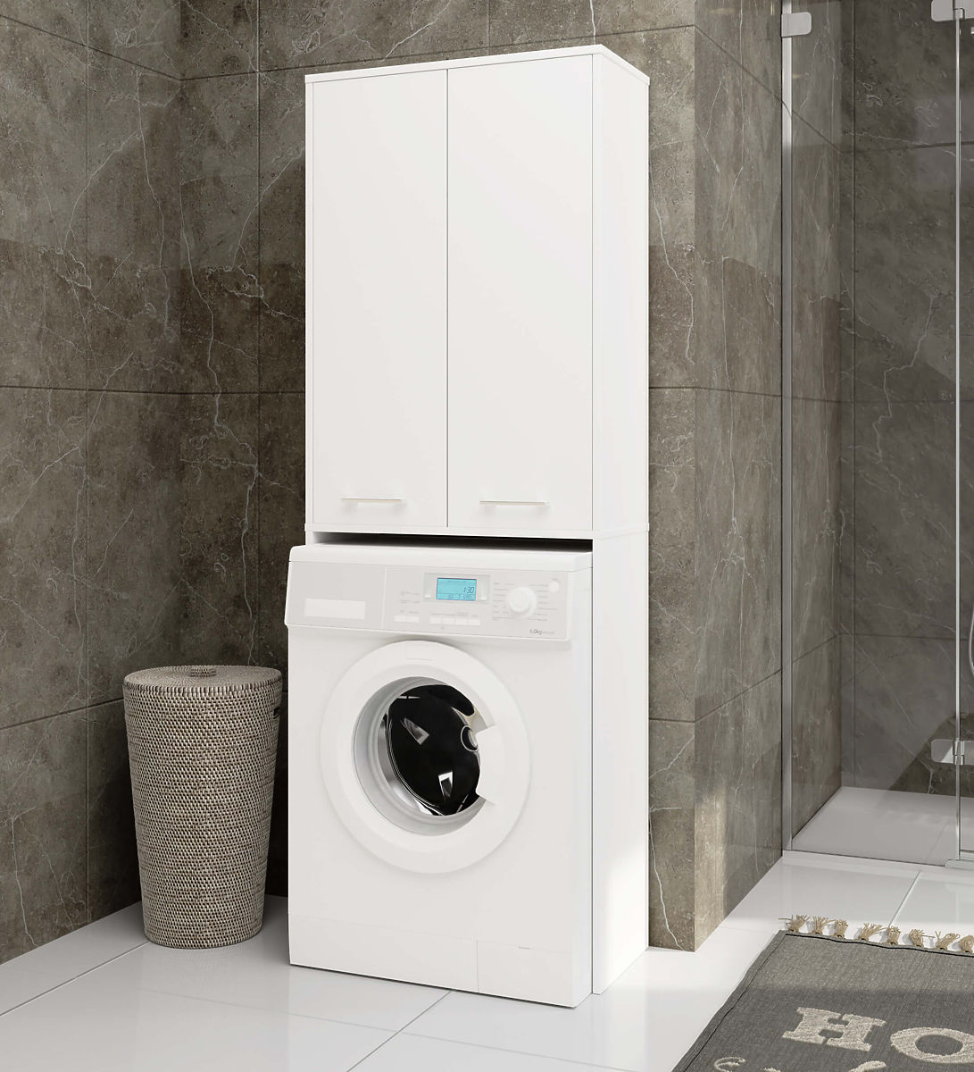 Stĺp nad práčku s úložným priestorom a bielym dizajnom. .. viac