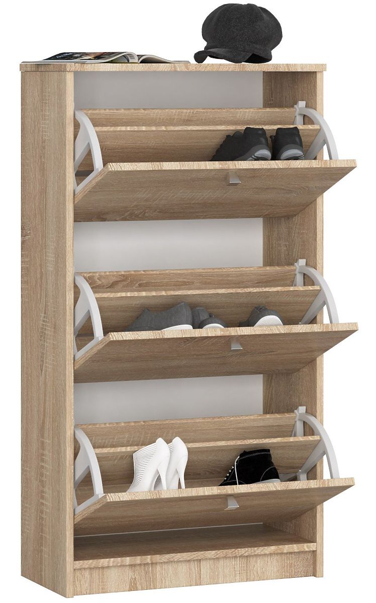 BOTNÍK 3 VÝKLOPNÉ DVERE Vyrobené z laminovanej dosky odolnej proti oderu. Hrany opatrené ABS hranou zabezpečujúcou odolnosť proti poškodeniu. Botník vo farbe dub sonoma Rozmery:Dĺžka - 60 cm Výška - 112,5 cm Hĺbka - 28,5 cm- Botník vyrobený z vysoko kvalitnej laminovanej dosky výrobcu Kronospan o hrúbke 16 mm odolnej proti oderu