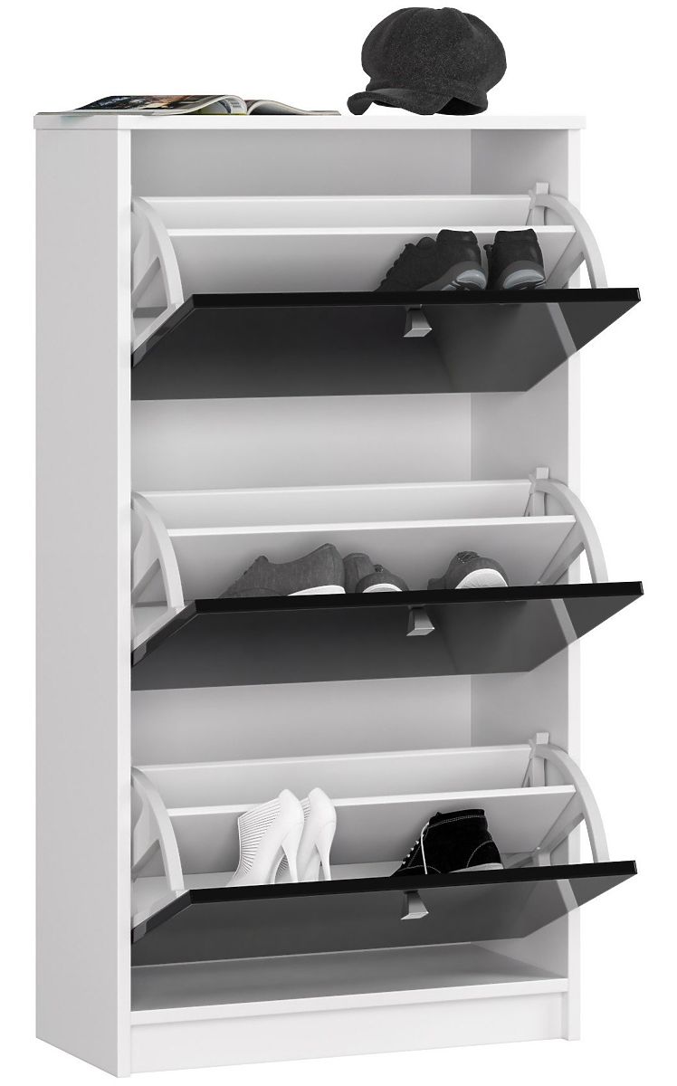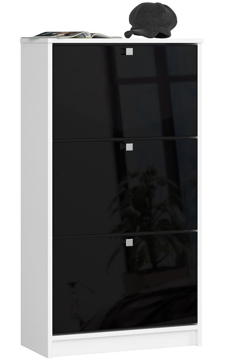V sortimente nášho internetového obchodu majú zákazníci možnosť nájsť mnoho rôznorodých botníkov, ktoré sa veľmi dobre hodia do predsiení - bez ohľadu na ich veľkosť a štýl usporiadania. Predstavovaný botník je zaujímavou ponukou spájajúcou kvalitu a dizajn na vysokej úrovni. Nábytok bez problémov pojme všetky páry topánok, ktoré nemusia byť na očiach a zaberať miesto, najmä v malých predsieniach. Botník je ľahko čistiteľný, očaruje moderným vzhľadom a jednoduchou údržbou. Spája dve najobľúbenejšie farby - bielu a čiernu. Sú to nadčasové farby, ktoré nikdy nevyjdú z módy. Botník zvonku pripomína komodu, ale skladá sa z troch výklopných zásuviek, ktoré sa ľahko otvárajú. Čelá botníka sú vyrobené z MDF dosky Akryl (19 milimetrov) s najvyšším štandardom lesku. Hrany sú olepené ABS hranou zabezpečujúcou výnimočnú odolnosť proti poškodeniu. Pozornosť si zaslúži aj cena nábytku.