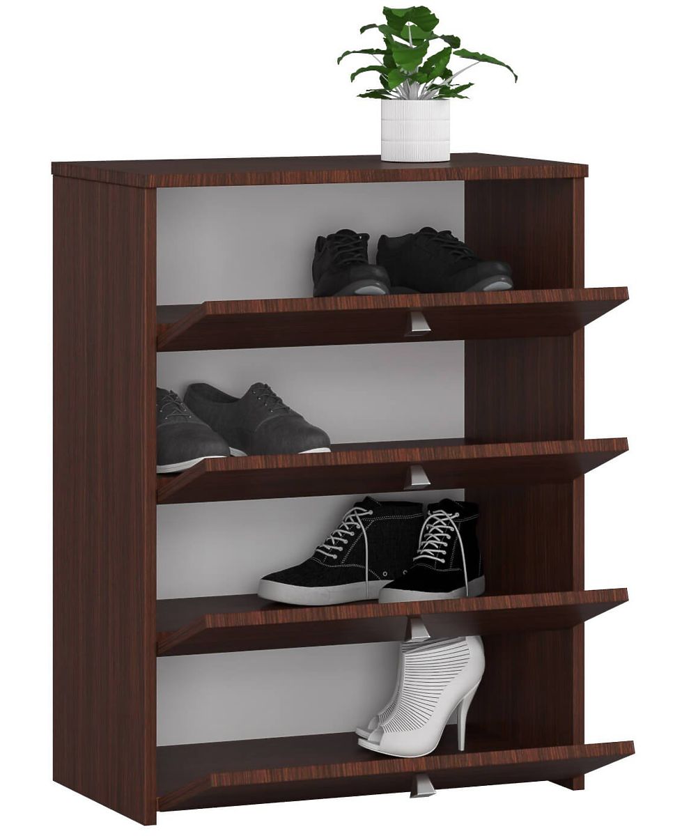 Botník vo farbe rubin wenge má štyri priestranné police s výklopnými dverami a úchytmi v saténovom odtieni. Malý nábytok sa hodí do každého typu predsiene, bez ohľadu na jej rozmery a štýl zariadenia miestnosti. Botník vo farbe rubin wenge bude skvele kontrastovať so svetlými stenami chodby. Nábytok vďaka svojej tlmenej farebnosti a starostlivému spracovaniu pôsobí elegantne a hodí sa ako do klasických, tak moderných aranžmánov. Botník je praktické a osvedčené riešenie tiež preto, že uľahčuje udržiavanie poriadku v predsieni, čím zvyšuje komfort používania tejto miestnosti. Na policiach určených pre obuv možno skladovať vonkajšie aj domáce topánky, kefy a pasty na čistenie topánok. Tým sa zabráni nevzhľadnému pohľadu na podlahu zastavanú topánkami. Botník je vyrobený z laminovanej dosky odolnej proti oderu a hrany sú zakončené trvanlivou ABS hranou.