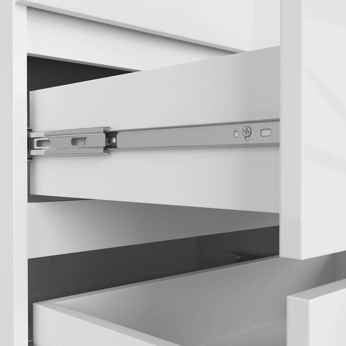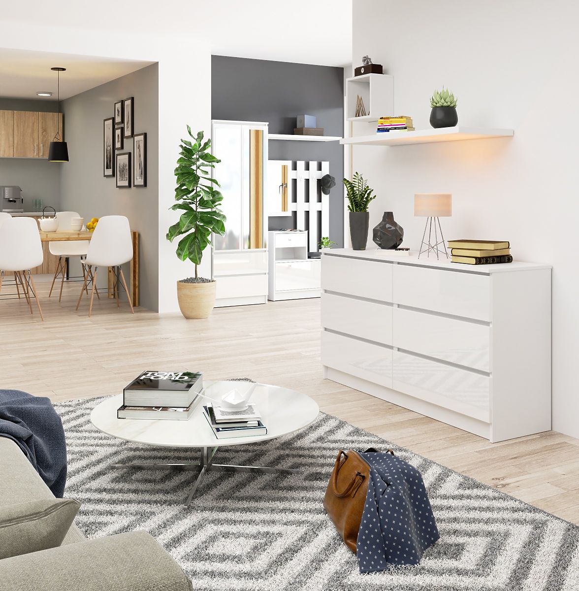 Hĺbka - 40 cm- Korpus komody vyrobený z 16mm laminovanej dosky biely mat odolný proti oderu - Čelá vyrobené z 19mm AKRYL dosky v dekore biely vysoký lesk