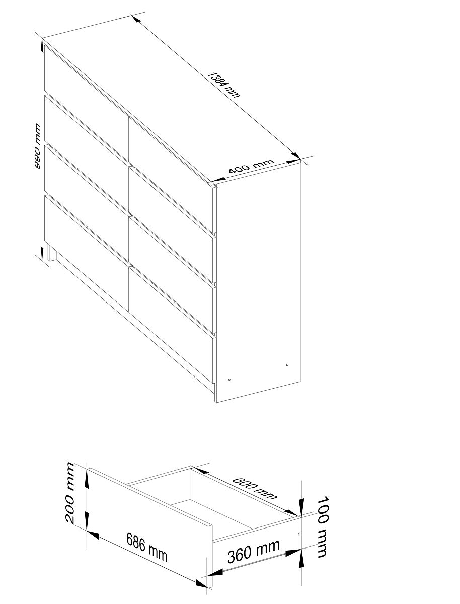 KOMODA K140 8 ZÁSUVIEK Vyrobená z laminovanej dosky 16mm odolnej proti oderu.