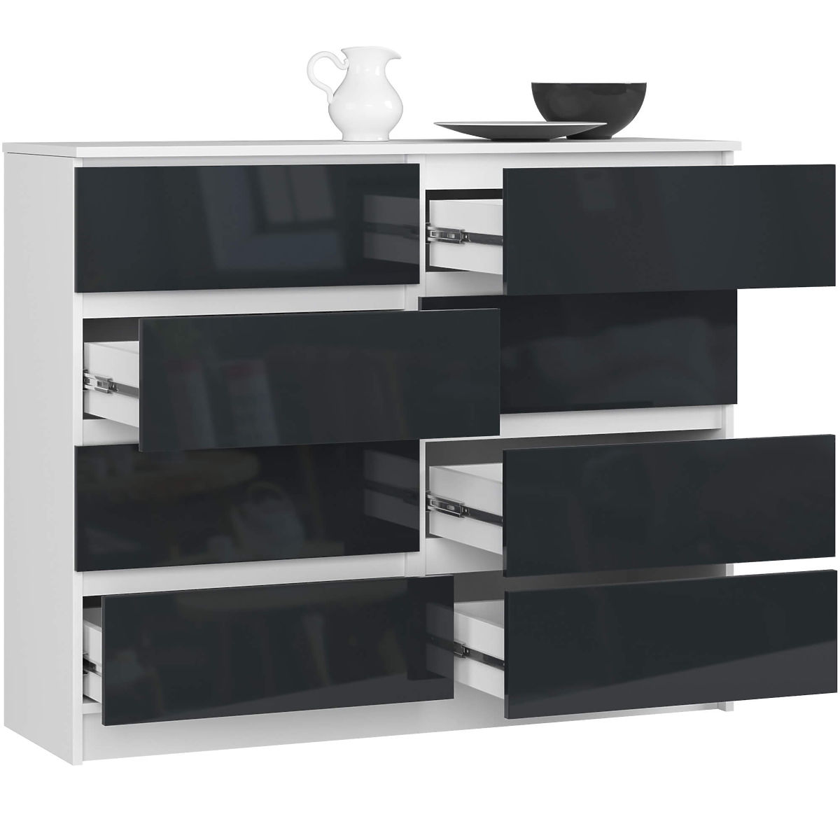 Hĺbka - 40cm- Korpus komody je vyrobený z 16mm bielej matnej laminovanej dosky odolnej proti oderu - Čelá sú z 19mm AKRYL dosky v dekore Grafit vysoký lesk