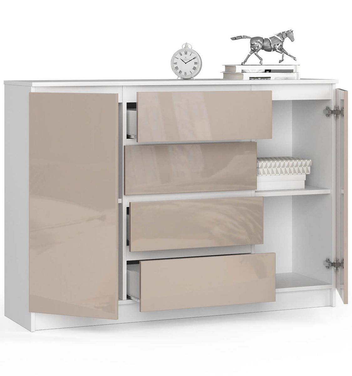 Veľká a priestranná komoda, ktorú charakterizuje moderný dizajn, určite osloví osoby, ktoré chcú sledovať trendy a zároveň hľadajú univerzálne riešenie. Prezentovaný model komody bol vytvorený s využitím laminovanej dosky o hrúbke 16 milimetrov (biely polomat) a dosky AKRYL dekor CAPPUCCINO o hrúbke 19 milimetrov (vysoký lesk). Nábytok sa ideálne hodí do kancelárie, ale aj do obytných priestorov - obývacích izieb, spální, jedální, izieb pre mládež a ďalších moderne zariadených interiérov. Komoda K140 je vybavená štyrmi priestrannými zásuvkami a dvoma uzatvárateľnými skrinkami. Krásny a solídne vyrobený produkt je k dispozícii za konkurencieschopnú cenu. Pozývame vás tiež k preskúmaniu ďalších návrhov z tejto série.