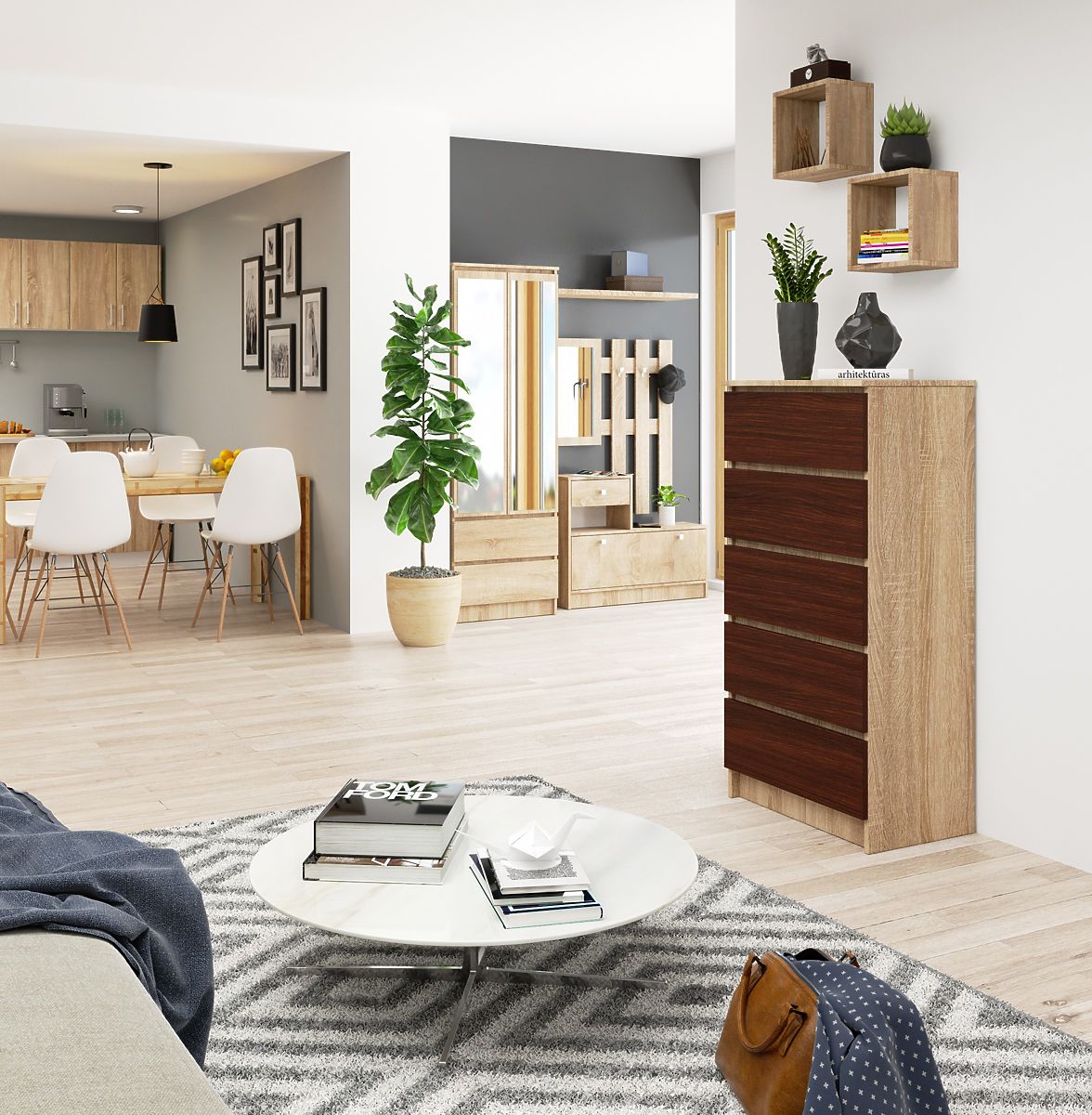 KOMODA K60 5 ZÁSUVIEK Vyrobená z laminovanej dosky 16 mm odolnej proti oderu.