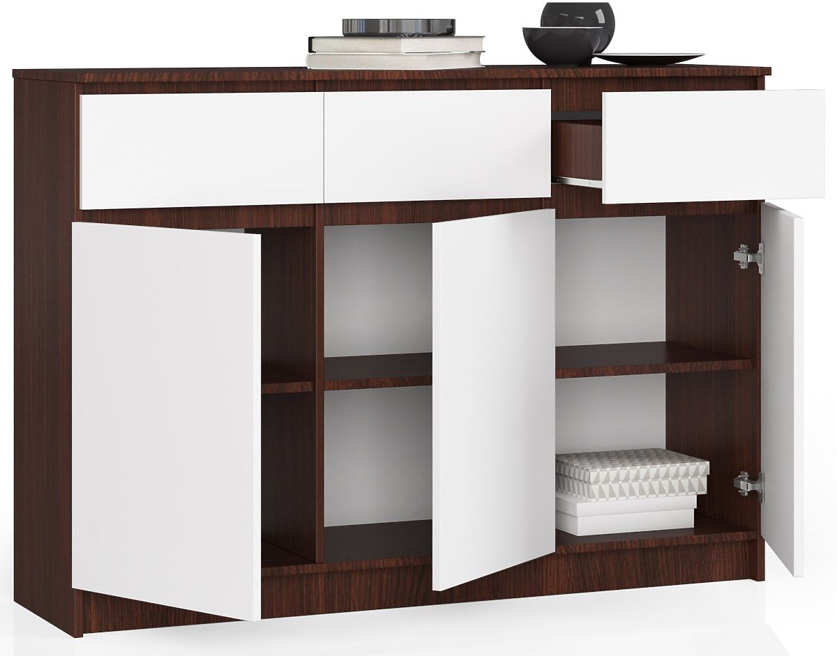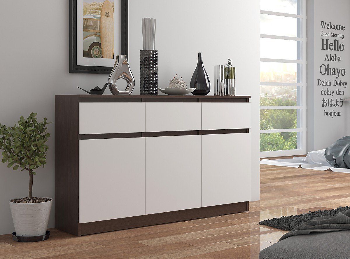 Veľká a štýlová komoda v tmavej farbe wenge s klasickými, hladkými a bielymi čelnými stranami skriniek a zásuviek. Vyrobená z odolnej laminovanej dosky s hrúbkou 16 mm. Hrany skrinky sú olepené pevnou ABS hranou, ktorá je odolnejšia proti poškriabaniu a mechanickému poškodeniu. Vybavená tromi funkčnými a priestrannými zásuvkami a tromi veľmi priestrannými skrinkami, vo vnútri každej je navyše polica. Zásuvky sa pohybujú na odolných kovových pojazdoch, v prípade potreby ich možno ľahko vybrať a dôkladne vyčistiť vo vnútri. Bezúchytkové čelné strany sú najmodernejším a módnym riešením, tešia sa veľkej obľube. Komoda bez problémov pojme všetko oblečenie a ďalšie domáce potreby, má veľmi veľa úložného priestoru a je pohodlná na používanie. Jednoduchý dizajn a minimalistický štýl robia tento nábytok univerzálnym, dokonale sa hodí do každého interiéru. Zapadne do klasického, elegantného aj moderného štýlu. Komoda bude vyzerať rovnako dobre v obývacej izbe, spálni, alebo dokonca v predsieni. Navyše možno tento model komody kombinovať s iným nábytkom v rovnakej farebnosti, čo umožňuje vytvorenie individuálneho, zladeného setu. Vďaka veľkej a priestrannej komode zavládne v každom dome poriadok, nebude chýbať úložný priestor.