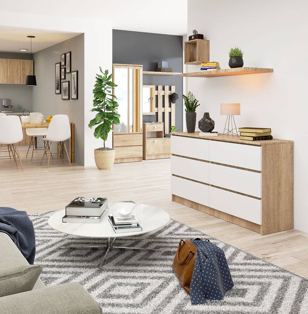 Veľká komoda vybavená šiestimi zásuvkami je zaujímavou ponukou vytvorenou na základe potrieb a očakávaní zákazníkov sledujúcich najnovšie trendy v aranžmánoch, ktorí preferujú svetlý, ľahko udržiavateľný a predovšetkým funkčný nábytok. Komoda K140 je kombináciou dvoch veľmi módnych farieb - bielej a dubu sonoma. Nábytok môže byť úspešne použitý v obývacej izbe, ako aj v izbe pre mládež alebo hostí. Hodí sa tiež do spálne, jedálne alebo kancelárie.
