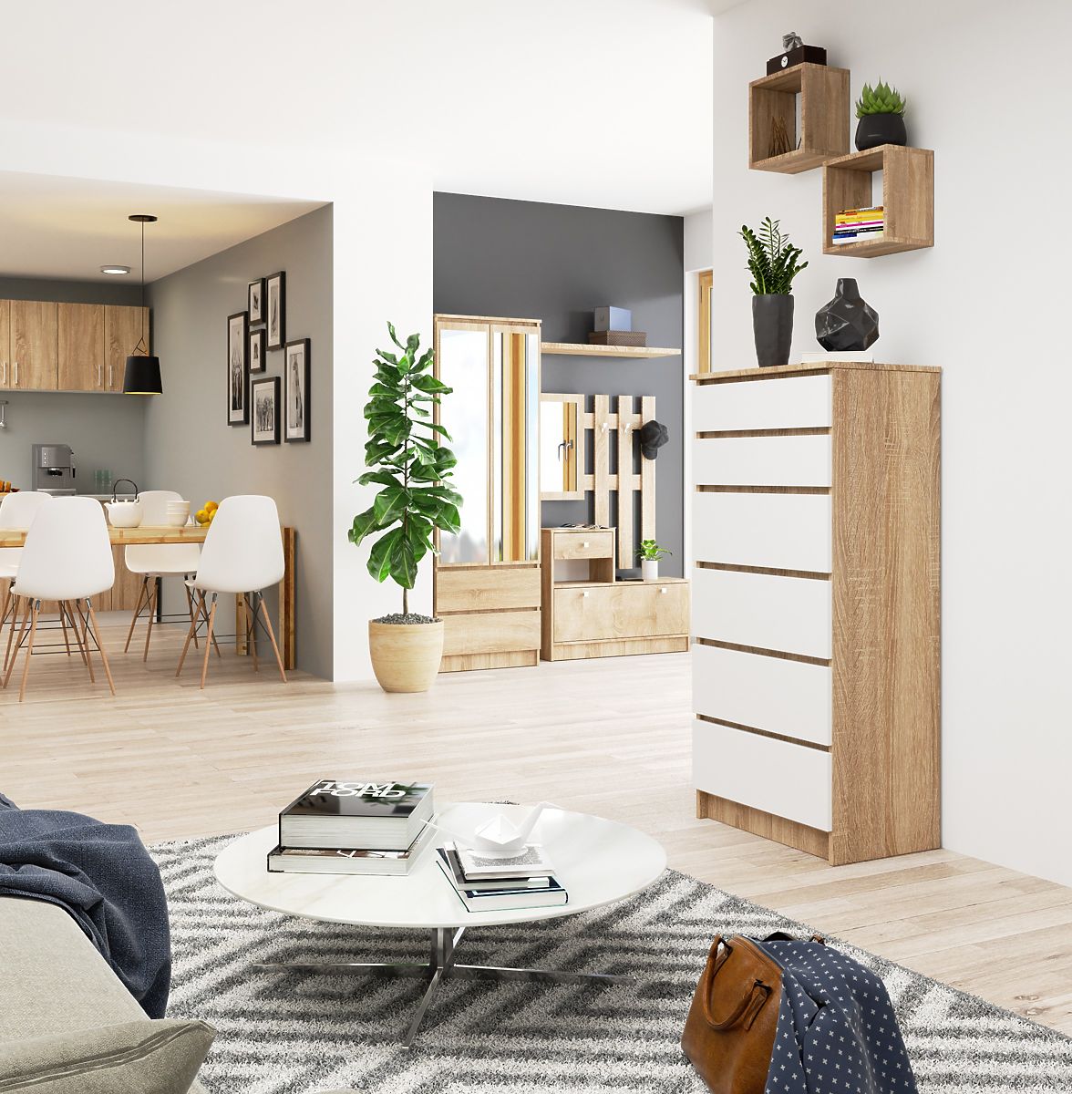 6 priestranných zásuviek, stabilná konštrukcia a nadčasový vzhľad - to je komoda K60! Vyniká príťažlivou kombináciou korpusu v elegantnej farbe dub sonoma a zásuviek s univerzálnymi bielymi čelami. Jej jednoduchý, ale zároveň efektný dizajn sa bude skvele vynímať nielen v spálni, predsieni, pracovni alebo obývacej izbe - je tiež ľahko kombinovateľný s ďalšími prvkami interiéru danej miestnosti. V sortimente nášho internetového obchodu s nábytkom Akord nájdete nábytok z tej istej kolekcie, ktorý sa hodí ku komode K60.