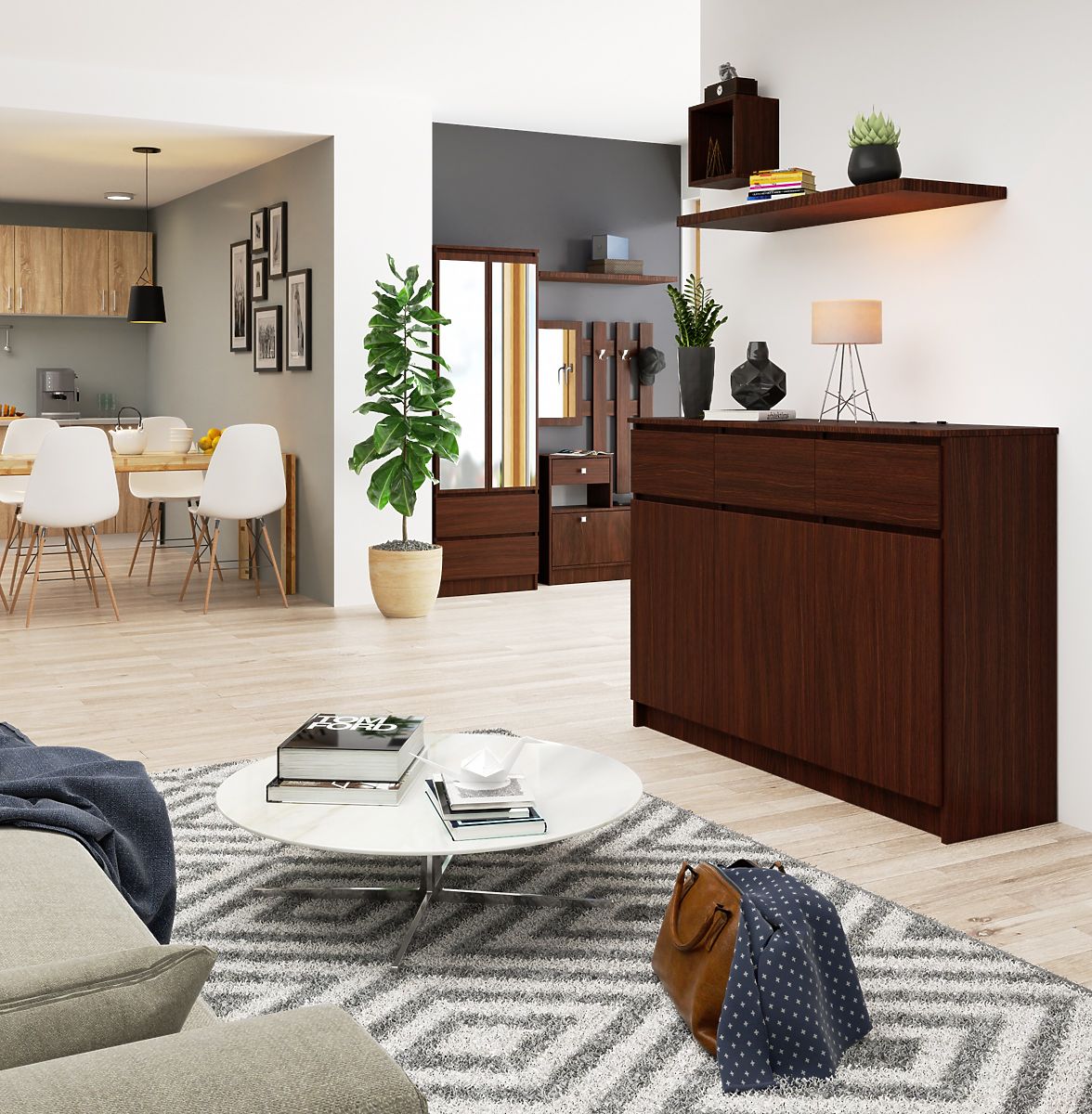 Priestranná komoda v módnej farbe wenge s tromi skrinkami a zásuvkami. .. viac