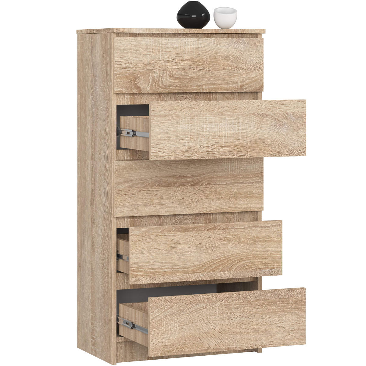Exemplár v krásnej farbe sonoma má päť priestranných zásuviek pracujúcich na trvanlivých guľôčkových pojazdoch. Zásuvky sa vysúvajú a zasúvajú veľmi jemne. Komoda má presne 60 centimetrov dĺžky, výška modelu je 121 centimetrov, zatiaľ čo hĺbka činí 40 centimetrov. Laminovaná doska použitá pri výrobe má 16 milimetrov, ABS hrany zvyšujú trvanlivosť a predlžujú životnosť nábytku. Celková hmotnosť komody dostupnej v našej ponuke je presne 36 kilogramov.