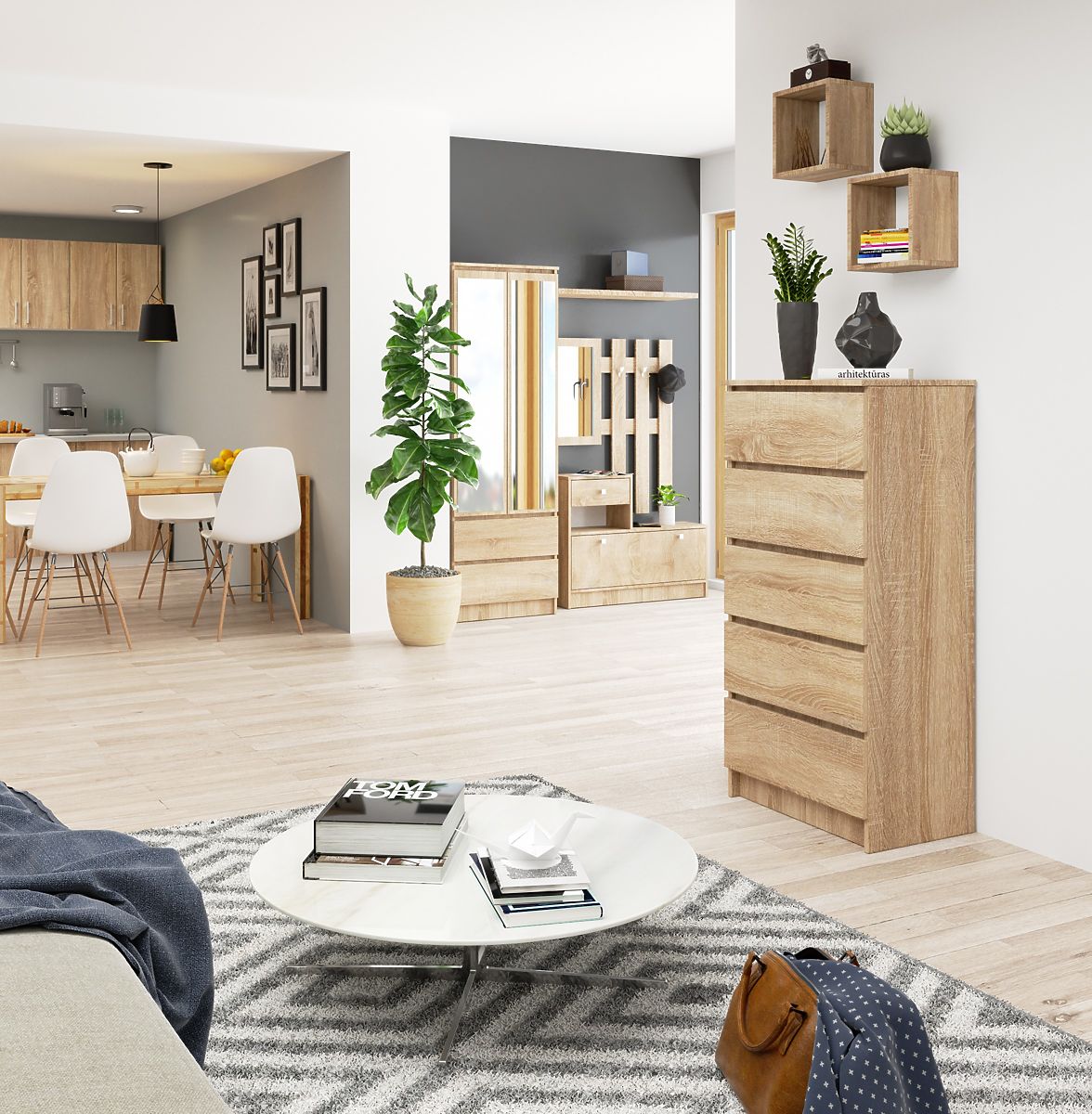 Predstavujeme vysoko kvalitnú komodu vytvorenú renomovanou spoločnosťou Kronospan. Tento model je odolný proti oderu, čo zaisťuje jeho dlhú životnosť. Ďalšou výhodou nábytku sú čelá zásuviek z spoľahlivej laminovanej dosky. Uvedené zásuvky sa pohybujú na kovových guľôčkových pojazdoch. Okrem toho boli hrany vyrobené z materiálu ABS. Komoda je dokončená v neotrelé a modernej farbe sonoma, ktorá sa hodí do svetlých a priestranných interiérov. Môže byť umiestnená v spálni, obývacej izbe alebo dokonca v predsieni - všetko vďaka svojej kapacite.